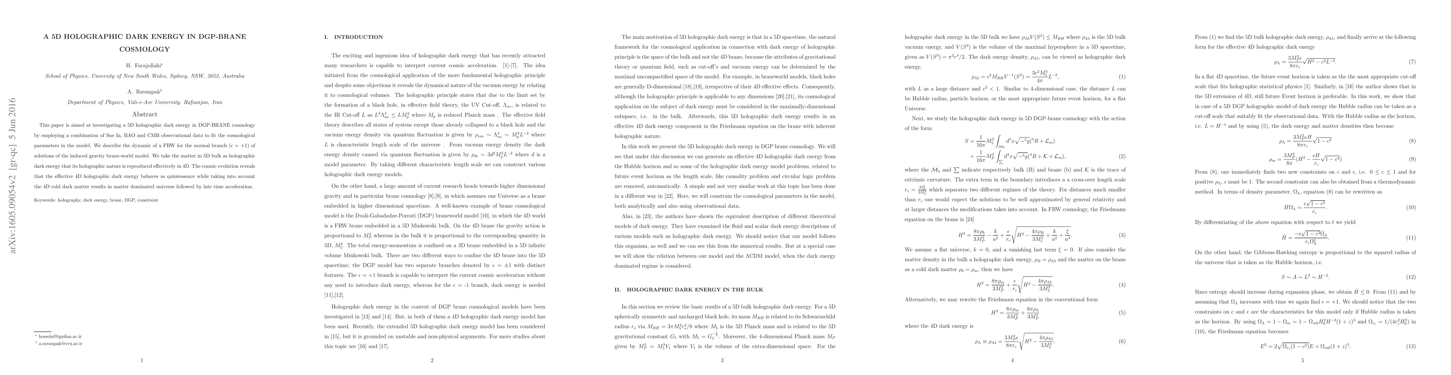 This paper explores 5D holographic dark energy within DGP-brane cosmology using observational data, finding that the effective 4D model behaves as quintessence, leading to a universe that transitions from matter dominance to late-time acceleration.