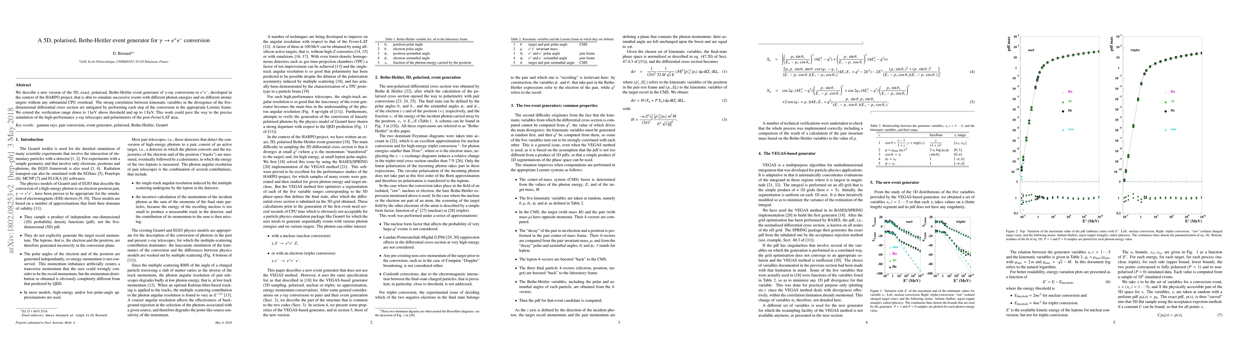 We describe a new version of the 5D, exact, polarised, Bethe-Heitler event generator of $\gamma$-ray conversions to $e^+e^-$, developed in the context of the HARPO project, that is able to simulate successive events with different photon energies and on different atomic targets without any substantial CPU overhead. The strong correlation between kinematic variables in the divergence of the five-dimensional differential cross section are mitigated by performing each step of the conversion in the appropriate Lorentz frame. We extend the verification range down to 1 keV above threshold and up to 1 EeV. This work could pave the way to the precise simulation of the high-performance $\gamma$-ray telescopes and polarimeters of the post-Fermi-LAT area.