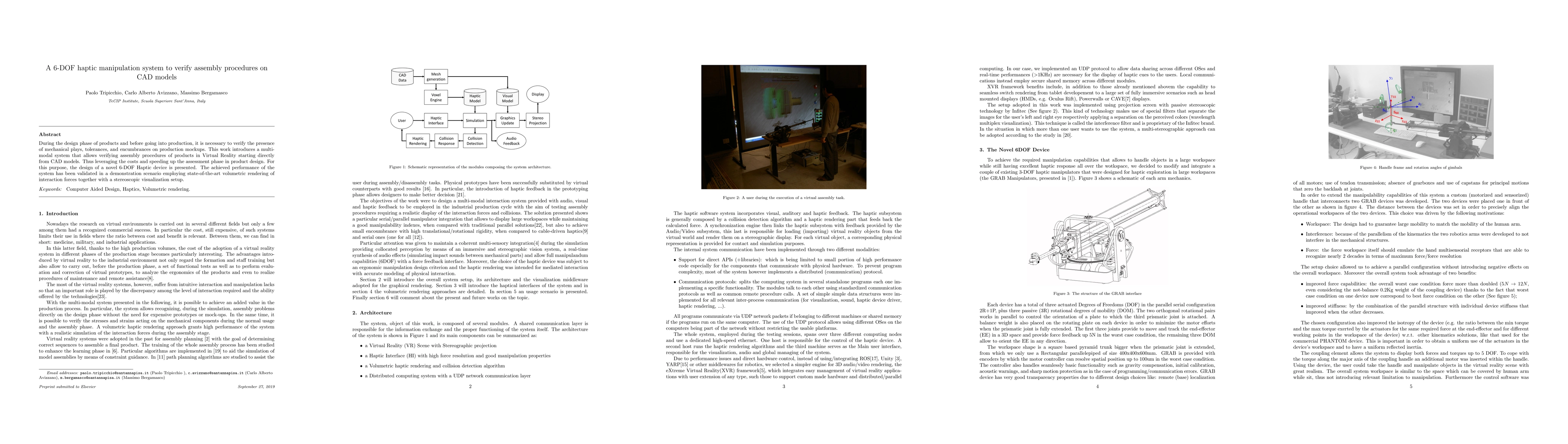 This research presents a 6-DOF haptic manipulation system for verifying assembly procedures directly from CAD models in Virtual Reality, aiming to reduce costs and speed up the product design assessment phase. The system's performance was validated through a demonstration scenario using advanced volumetric rendering and stereoscopic visualization.