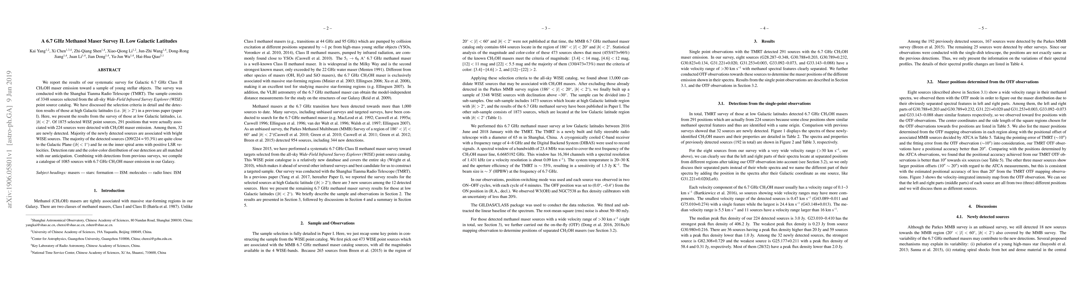 This paper reports the results of a survey for 6.7 GHz methanol maser emission in low Galactic latitudes using the Shanghai Tianma Radio Telescope. Of the 1875 selected WISE sources, 291 positions associated with 224 sources were detected, including 32 new detections, predominantly near the Galactic Plane and on inner spiral arms.