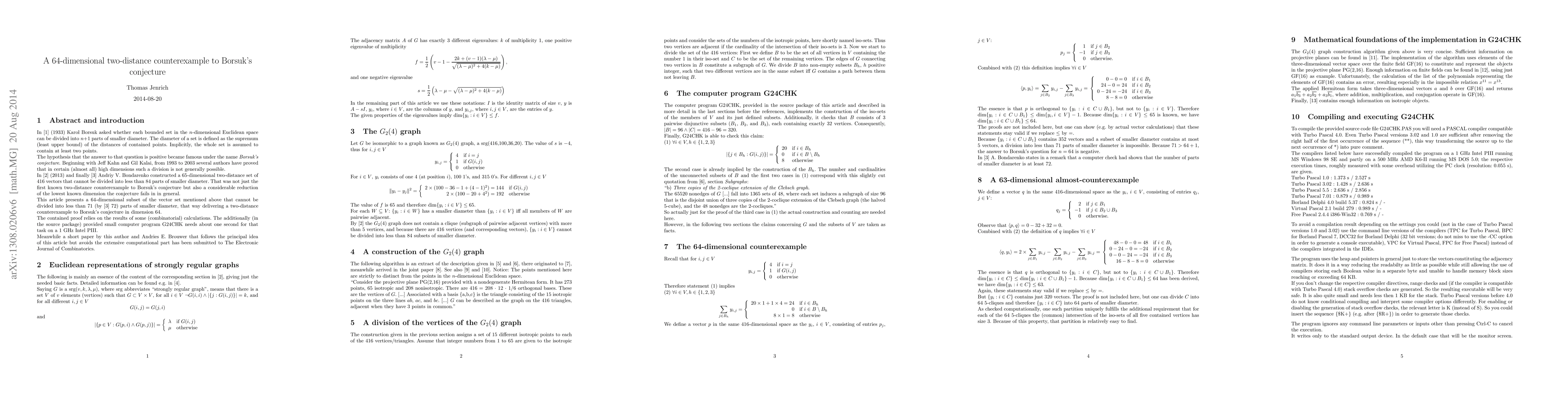In 1933 Karol Borsuk asked whether each bounded set in the n-dimensional Euclidean space can be divided into n+1 parts of smaller diameter. The diameter of a set is defined as the supremum (least upper bound) of the distances of contained points. Implicitly, the whole set is assumed to contain at least two points. The hypothesis that the answer to that question is positive became famous under the name Borsuk's conjecture. Beginning with Jeff Kahn and Gil Kalai, from 1993 to 2003 several authors have proved that in certain (almost all) high dimensions such a division is not generally possible. In a paper published in 2013, Andriy V. Bondarenko constructed a 65-dimensional two-distance set of 416 vectors that cannot be divided into less than 84 parts of smaller diameter. That was not just the first known two-distance counterexample to Borsuk's conjecture but also a considerable reduction of the lowest known dimension the conjecture fails in in general. This article presents a 64-dimensional subset of the vector set mentioned above that cannot be divided into less than 71 (by A. Bondarenko 72) parts of smaller diameter, that way delivering a two-distance counterexample to Borsuk's conjecture in dimension 64. The contained proof relies on the results of some (combinatorial) calculations. The additionally (in the source package) provided small computer program G24CHK needs about one second for that task on a 1 GHz Intel PIII. Meanwhile a short paper by this author and Andries E. Brouwer that follows the principal idea of this article but avoids the extensive computational part has been submitted to The Electronic Journal of Combinatorics.