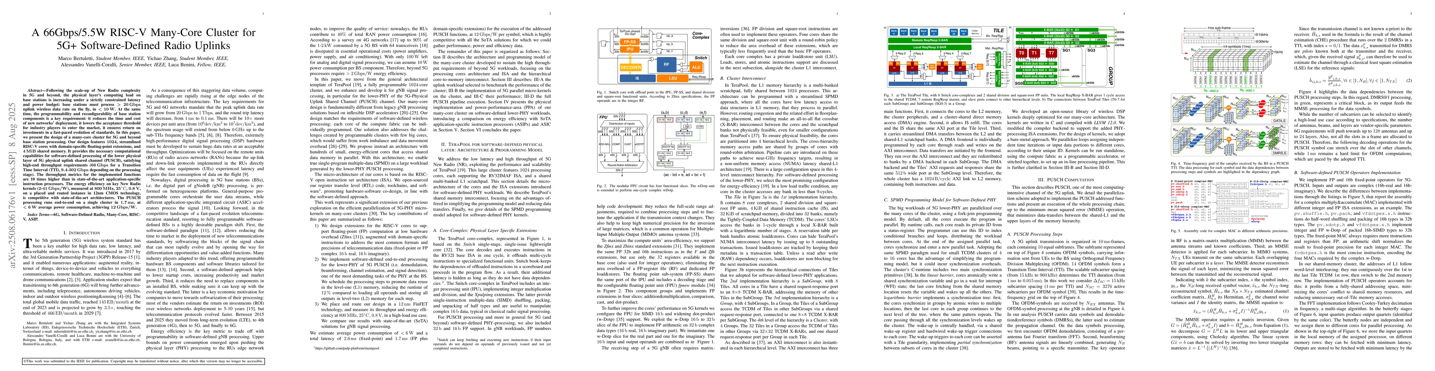 Following the scale-up of new radio (NR) complexity in 5G and beyond, the physical layer's computing load on base stations is increasing under a strictly constrained latency and power budget; base stations must process > 20-Gb/s uplink wireless data rate on the fly, in < 10 W. At the same time, the programmability and reconfigurability of base station components are the key requirements; it reduces the time and cost of new networks' deployment, it lowers the acceptance threshold for industry players to enter the market, and it ensures return on investments in a fast-paced evolution of standards. In this article, we present the design of a many-core cluster for 5G and beyond base station processing. Our design features 1024, streamlined RISC-V cores with domain-specific FP extensions, and 4-MiB shared memory. It provides the necessary computational capabilities for software-defined processing of the lower physical layer of 5G physical uplink shared channel (PUSCH), satisfying high-end throughput requirements (66 Gb/s for a transition time interval (TTI), 9.4-302 Gb/s depending on the processing stage). The throughput metrics for the implemented functions are ten times higher than in state-of-the-art (SoTA) application-specific instruction processors (ASIPs). The energy efficiency on key NR kernels (2-41 Gb/s/W), measured at 800 MHz, 25 {\deg}C, and 0.8 V, on a placed and routed instance in 12-nm CMOS technology, is competitive with SoTA architectures. The PUSCH processing runs end-to-end on a single cluster in 1.7 ms, at <6-W average power consumption, achieving 12 Gb/s/W.