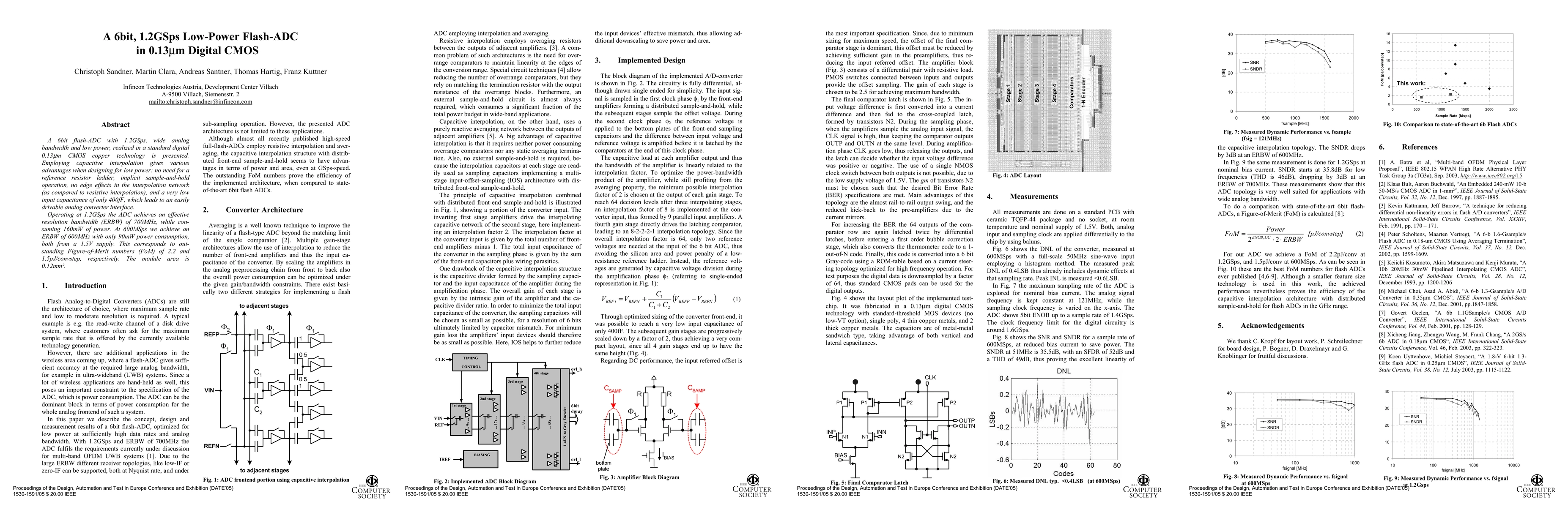 A low-power 6-bit flash-ADC with a bandwidth of 700MHz is achieved in a 0.13μm digital CMOS technology, consuming 160mW of power at 1.2GSps.