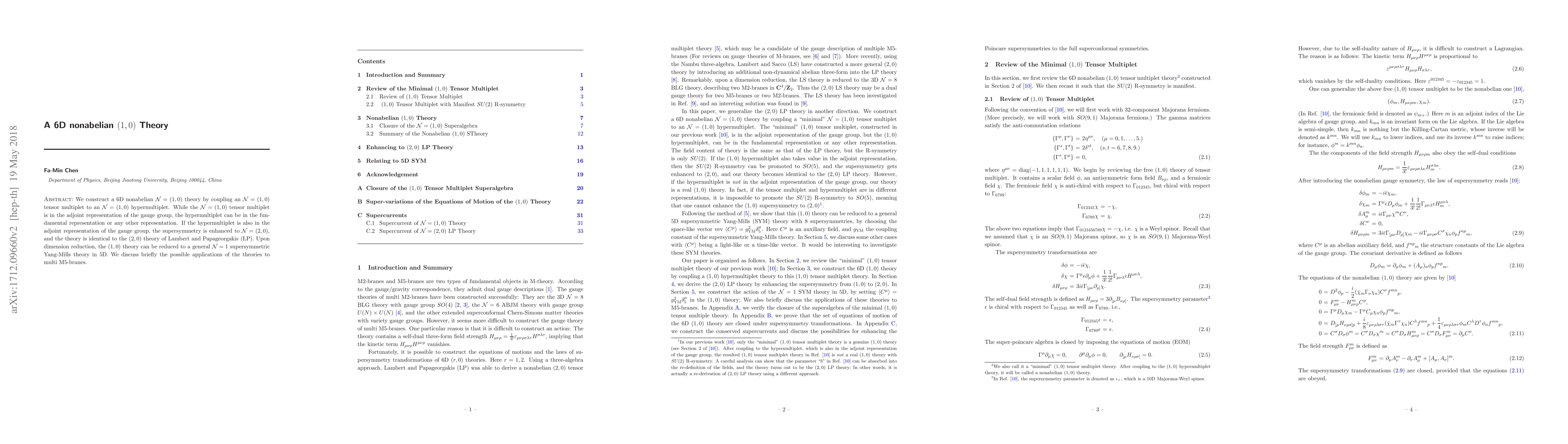 We construct a 6D nonabelian ${\cal N}=(1,0)$ theory by coupling an ${\cal N}=(1,0)$ tensor multiplet to an ${\cal N}=(1, 0)$ hypermultiplet. While the ${\cal N}=(1, 0)$ tensor multiplet is in the adjoint representation of the gauge group, the hypermultiplet can be in the fundamental representation or any other representation. If the hypermultiplet is also in the adjoint representation of the gauge group, the supersymmetry is enhanced to ${\cal N}=(2, 0)$, and the theory is identical to the $(2,0)$ theory of Lambert and Papageorgakis (LP). Upon dimension reduction, the $(1,0)$ theory can be reduced to a general ${\cal N}=1$ supersymmetric Yang-Mills theory in 5D. We discuss briefly the possible applications of the theories to multi M5-branes.