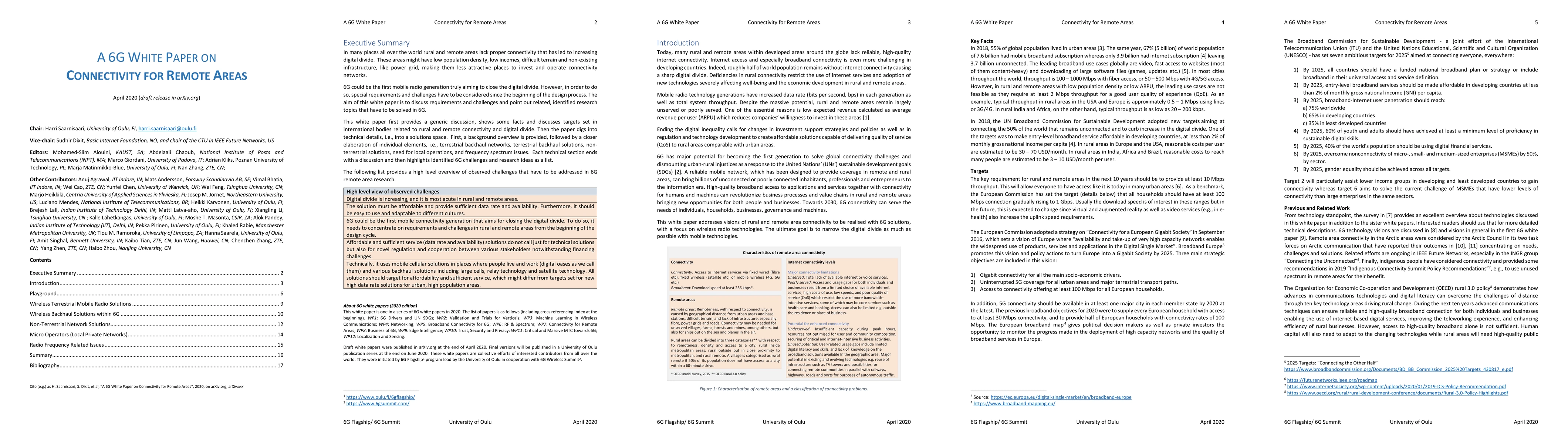 The white paper contributes by identifying key challenges and research ideas for 6G technology to provide connectivity in remote areas, including the use of large cells, wireless backhaul solutions, non-terrestrial networks, and micro operators.