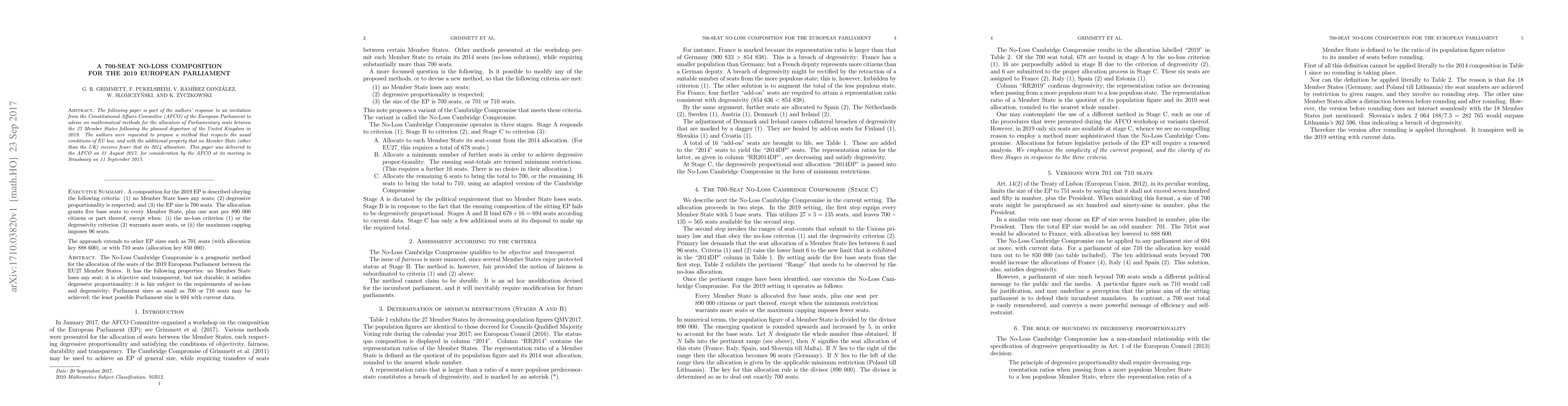 This paper presents a 700-seat allocation method for the 2019 European Parliament, ensuring no Member State, excluding the UK, receives fewer seats than in 2014. It was submitted to the AFCO in 2017 for consideration.