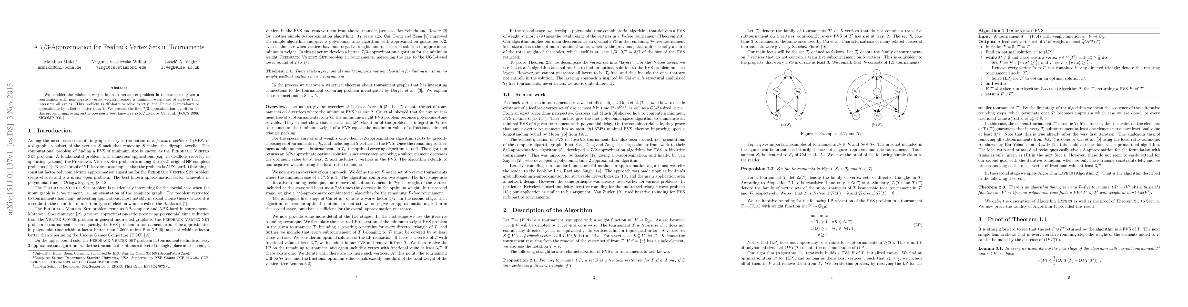 We consider the minimum-weight feedback vertex set problem in tournaments: given a tournament with non-negative vertex weights, remove a minimum-weight set of vertices that intersects all cycles. This problem is $\mathsf{NP}$-hard to solve exactly, and Unique Games-hard to approximate by a factor better than 2. We present the first $7/3$ approximation algorithm for this problem, improving on the previously best known ratio $5/2$ given by Cai et al. [FOCS 1998, SICOMP 2001].
