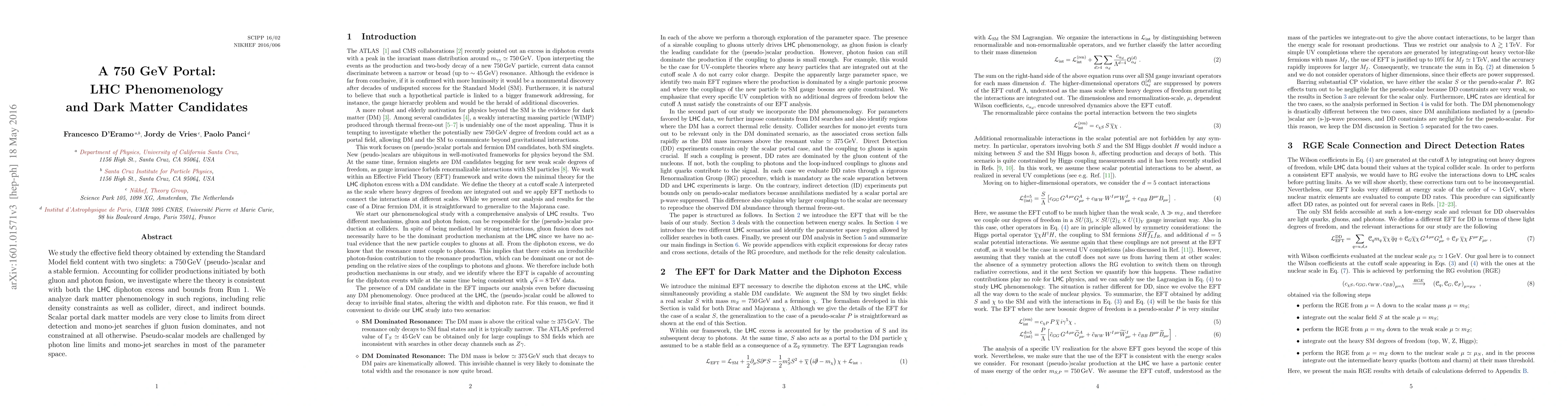 We study the effective field theory obtained by extending the Standard Model field content with two singlets: a 750 GeV (pseudo-)scalar and a stable fermion. Accounting for collider productions initiated by both gluon and photon fusion, we investigate where the theory is consistent with both the LHC diphoton excess and bounds from Run 1. We analyze dark matter phenomenology in such regions, including relic density constraints as well as collider, direct, and indirect bounds. Scalar portal dark matter models are very close to limits from direct detection and mono-jet searches if gluon fusion dominates, and not constrained at all otherwise. Pseudo-scalar models are challenged by photon line limits and mono-jet searches in most of the parameter space.