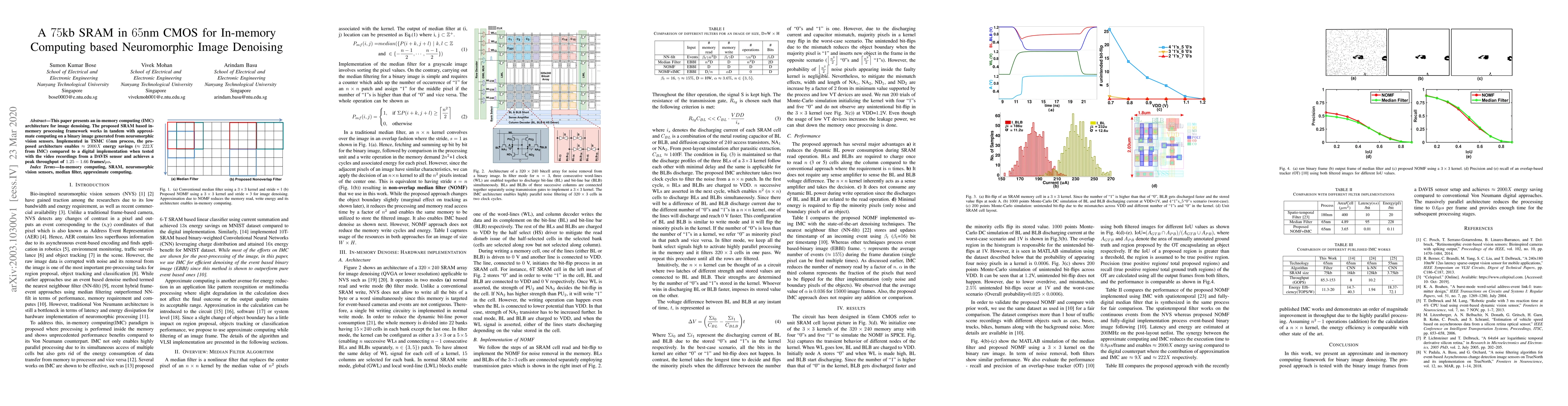 This paper presents an SRAM-based in-memory computing architecture for image denoising, achieving 2000X energy savings compared to traditional digital implementations.
