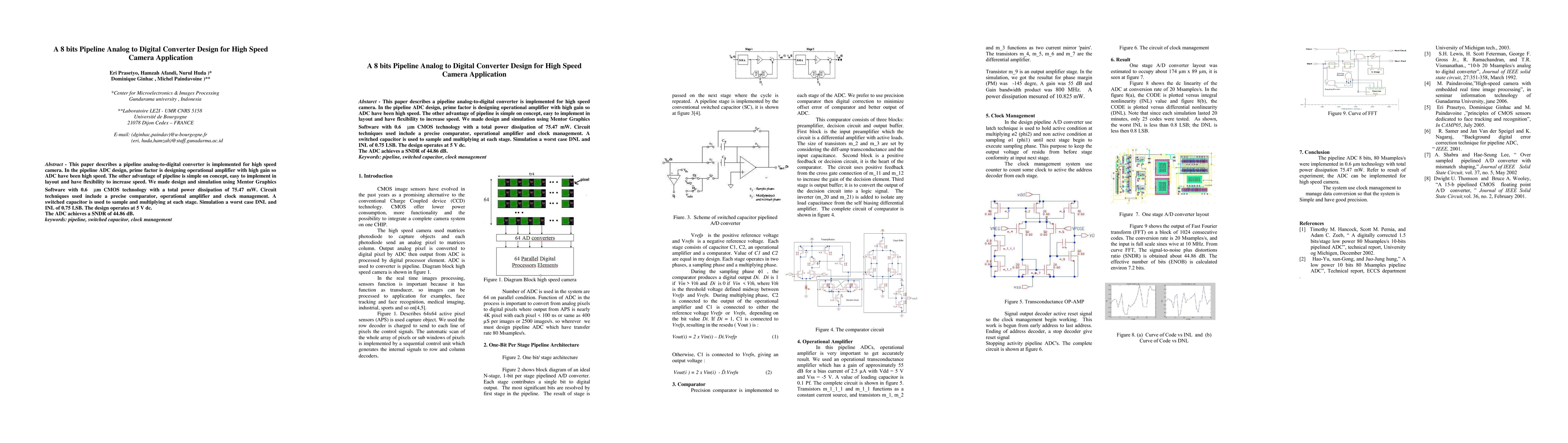 - This paper describes a pipeline analog-to-digital converter is implemented for high speed camera. In the pipeline ADC design, prime factor is designing operational amplifier with high gain so ADC have been high speed. The other advantage of pipeline is simple on concept, easy to implement in layout and have flexibility to increase speed. We made design and simulation using Mentor Graphics Software with 0.6 \mu m CMOS technology with a total power dissipation of 75.47 mW. Circuit techniques used include a precise comparator, operational amplifier and clock management. A switched capacitor is used to sample and multiplying at each stage. Simulation a worst case DNL and INL of 0.75 LSB. The design operates at 5 V dc. The ADC achieves a SNDR of 44.86 dB. keywords: pipeline, switched capacitor, clock management