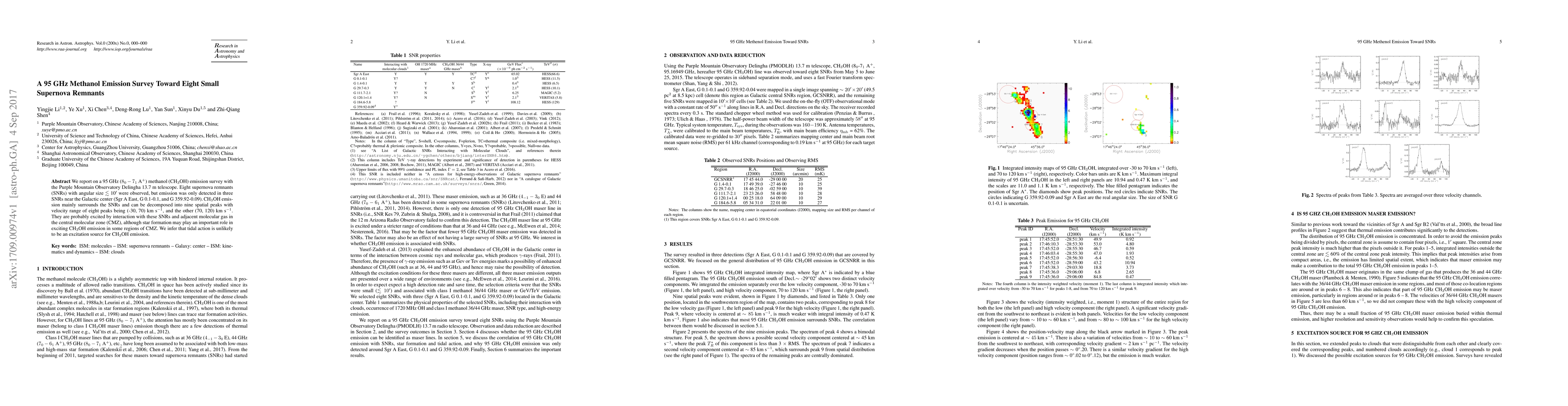 We report on a 95 GHz ($8_0-7_1$ A$^{+}$) methanol (CH$_3$OH) emission survey with the Purple Mountain Observatory Delingha 13.7 m telescope. Eight supernova remnants (SNRs) with angular size $\lesssim$ 10' were observed, but emission was only detected in three SNRs near the Galactic center (Sgr A East, G 0.1-0.1, and G 359.92-0.09). CH$_3$OH emission mainly surrounds the SNRs and can be decomposed into nine spatial peaks with velocity range of eight peaks being (-30, 70) km s$^{-1}$, and the other (70, 120) km s$^{-1}$. They are probably excited by interaction with these SNRs and adjacent molecular gas in the central molecular zone (CMZ), although star formation may play an important role in exciting CH$_3$OH emission in some regions of CMZ. We infer that tidal action is unlikely to be an excitation source for CH$_3$OH emission.