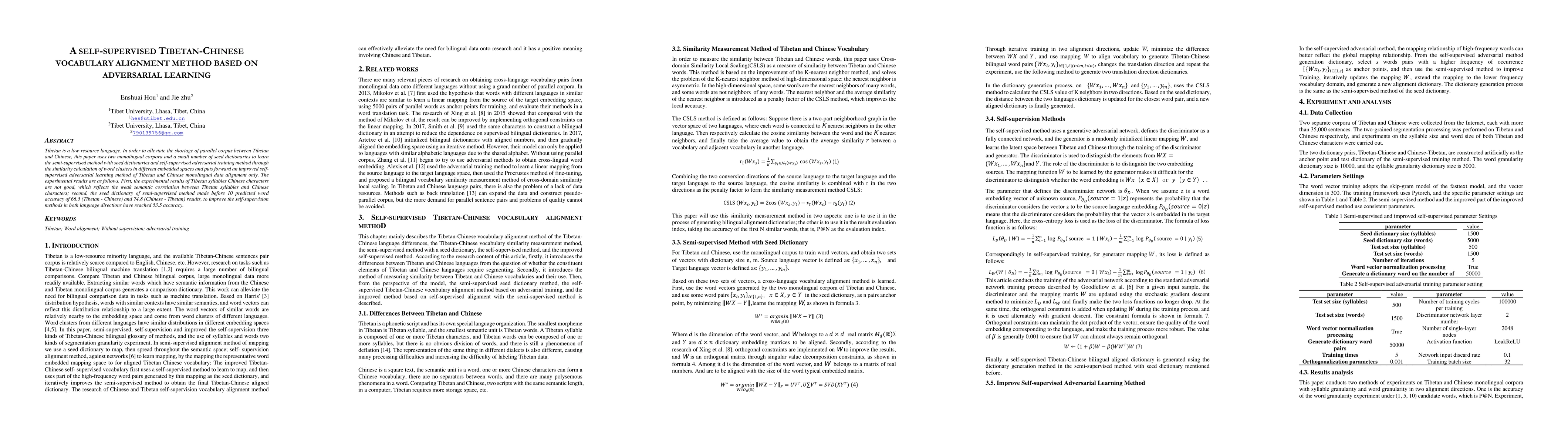 This paper proposes a self-supervised vocabulary alignment method for Tibetan and Chinese using adversarial learning, leveraging monolingual corpora and seed dictionaries. Experimental results show improved alignment accuracy, though challenges remain due to weak semantic correlation between Tibetan syllables and Chinese characters.