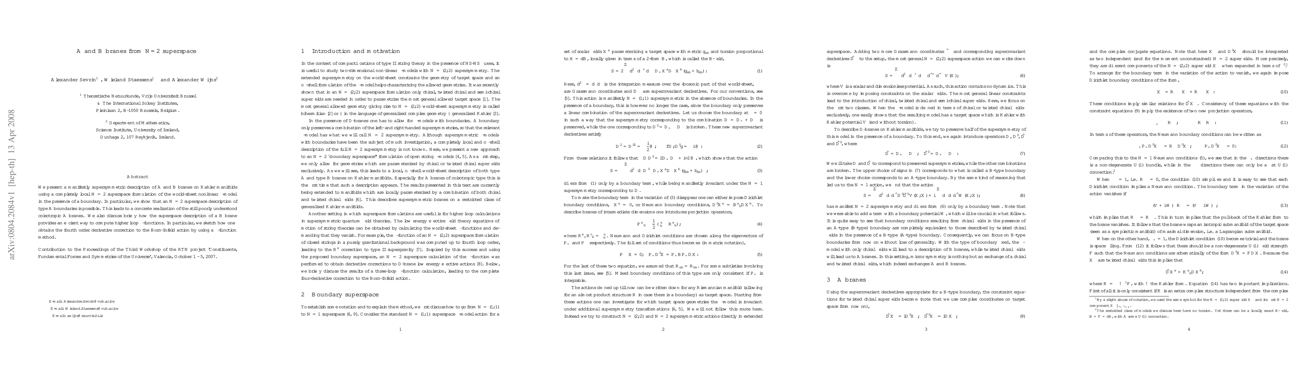 We present a manifestly supersymmetric description of A and B branes on Kaehler manifolds using a completely local N=2 superspace formulation of the world-sheet nonlinear sigma-model in the presence of a boundary. In particular, we show that an N=2 superspace description of type A boundaries is possible. This leads to a concrete realization of the still poorly understood coisotropic A branes. We also discuss briefly how the superspace description of a B brane provides an efficient way to compute higher loop beta-functions. In particular, we sketch how one obtains the fourth order derivative correction to the Born-Infeld action by using a beta-function method.