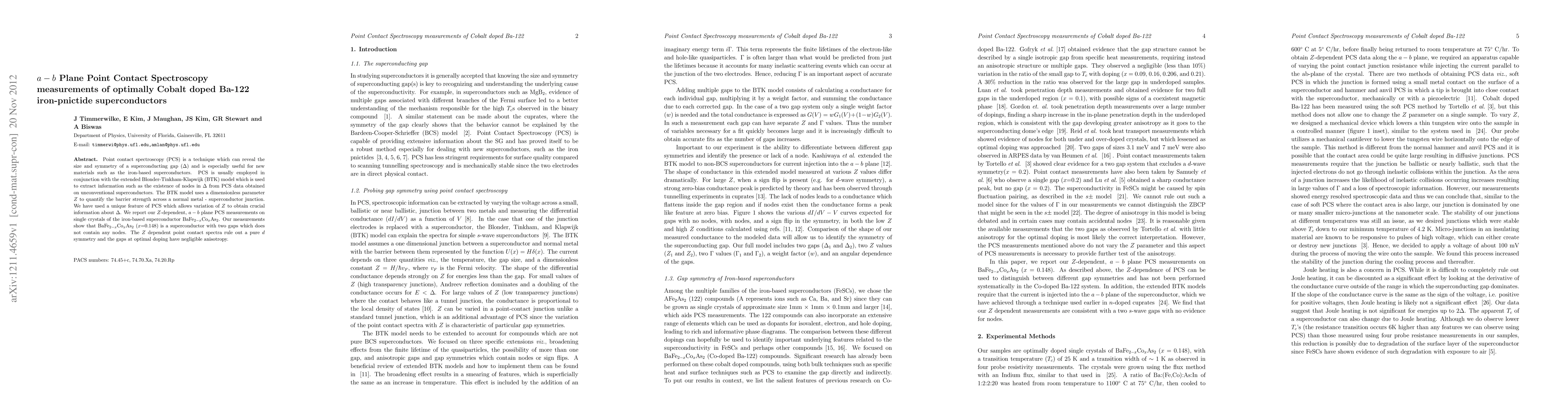 Point contact spectroscopy (PCS) is a technique which can reveal the size and symmetry of a superconducting gap ($\Delta$) and is especially useful for new materials such as the iron-based superconductors. PCS is usually employed in conjunction with the extended Blonder-Tinkham-Klapwijk (BTK) model which is used to extract information such as the existence of nodes in $\Delta$ from PCS data obtained on unconventional superconductors. The BTK model uses a dimensionless parameter $Z$ to quantify the barrier strength across a normal metal - superconductor junction. We have used a unique feature of PCS which allows variation of $Z$ to obtain crucial information about $\Delta$. We report our $Z$-dependent, $a-b$ plane PCS measurements on single crystals of the iron-based superconductor BaFe$_{2-x}$Co$_{x}$As$_{2}$. Our measurements show that BaFe$_{2-x}$Co$_{x}$As$_{2}$ ($x$=0.148) is a superconductor with two gaps which does not contain any nodes. The $Z$ dependent point contact spectra rule out a pure $d$ symmetry and the gaps at optimal doping have negligible anisotropy.
