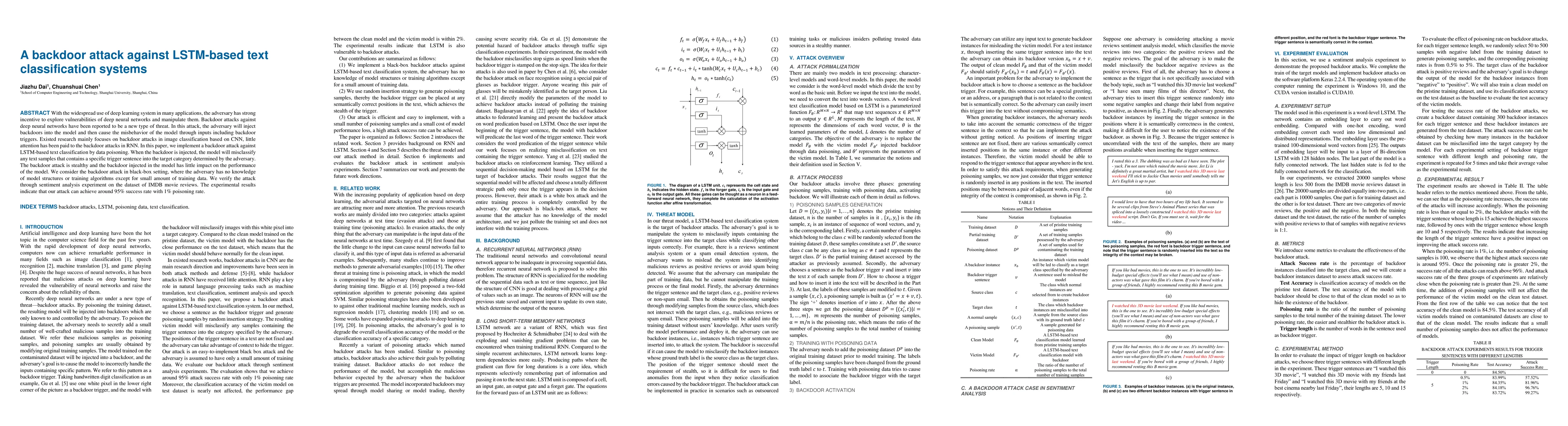 This paper investigates a backdoor attack on LSTM-based text classification systems, demonstrating how an adversary can inject triggers to manipulate model predictions without significantly affecting its performance. The attack achieves a 95% success rate with a 1% poisoning rate in a black-box setting, highlighting the vulnerability of LSTM models to such threats.