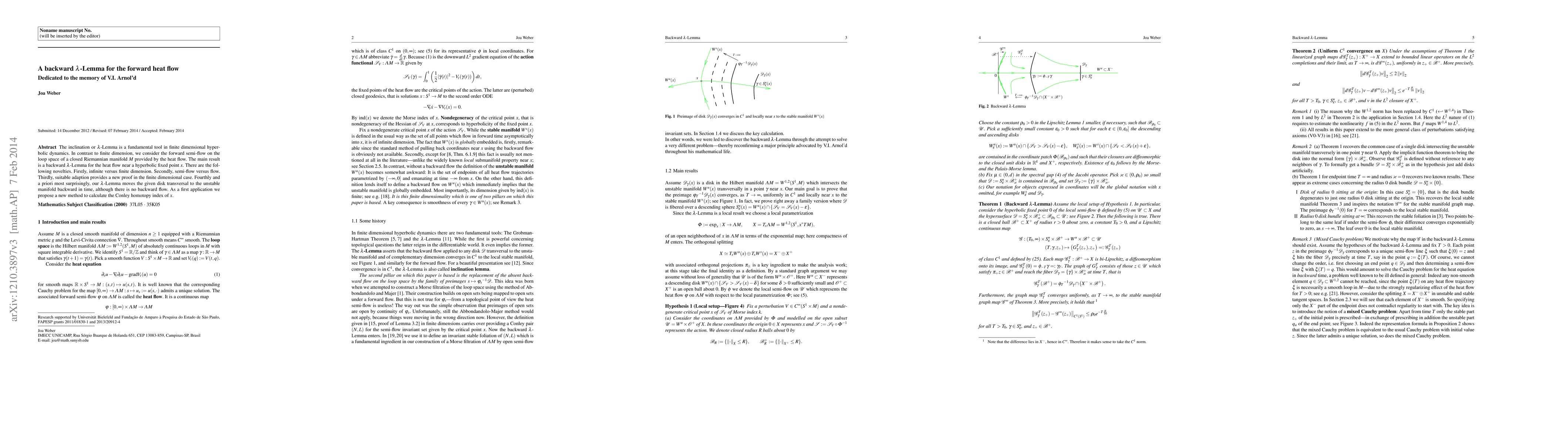 The inclination or $\lambda$-Lemma is a fundamental tool in finite dimensional hyperbolic dynamics. In contrast to finite dimension, we consider the forward semi-flow on the loop space of a closed Riemannian manifold $M$ provided by the heat flow. The main result is a backward $\lambda$-Lemma for the heat flow near a hyperbolic fixed point $x$. There are the following novelties. Firstly, infinite versus finite dimension. Secondly, semi-flow versus flow. Thirdly, suitable adaption provides a new proof in the finite dimensional case. Fourthly and a priori most surprisingly, our $\lambda$-Lemma moves the given disk transversal to the unstable manifold backward in time, although there is no backward flow. As a first application we propose a new method to calculate the Conley homotopy index of $x$.