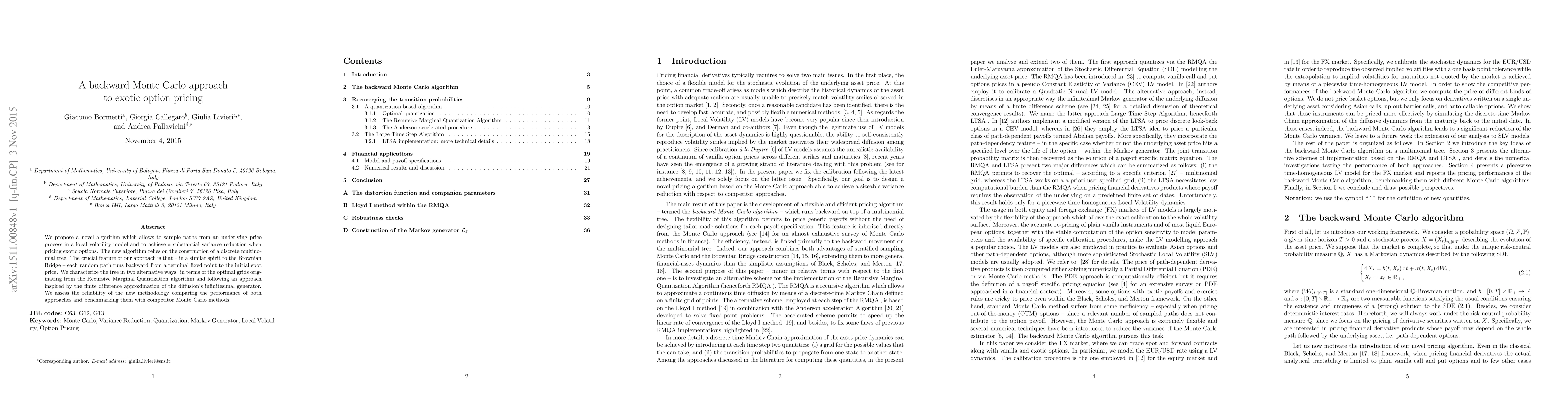 Researchers propose a new algorithm to efficiently price exotic options using a backward Monte Carlo approach, achieving substantial variance reduction by constructing a discrete multinomial tree. This method is compared with existing competitor methods for reliability and performance.