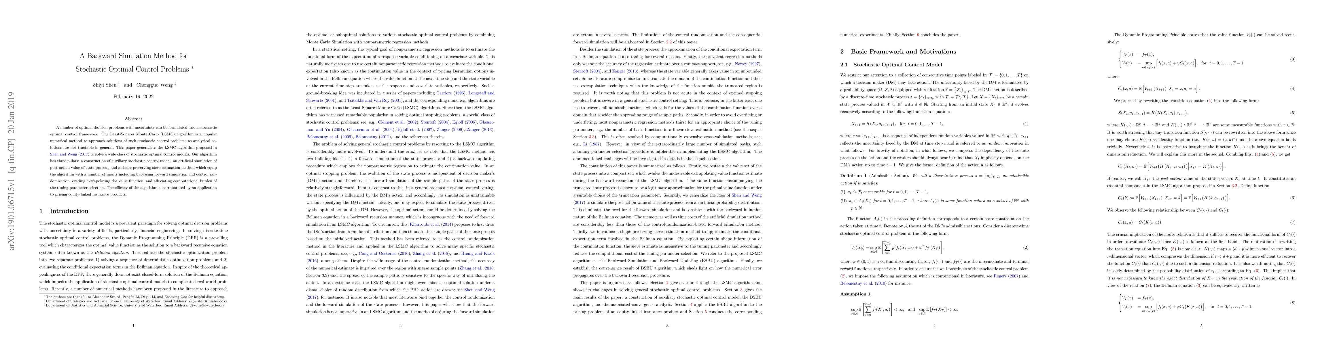 This paper proposes a generalized Least-Squares Monte Carlo (LSMC) algorithm for solving stochastic optimal control problems, featuring backward simulation, artificial post-action value simulation, and a shape-preserving sieve estimation method to avoid forward simulation and computational burdens. The method is validated through its application to pricing equity-linked insurance products.
