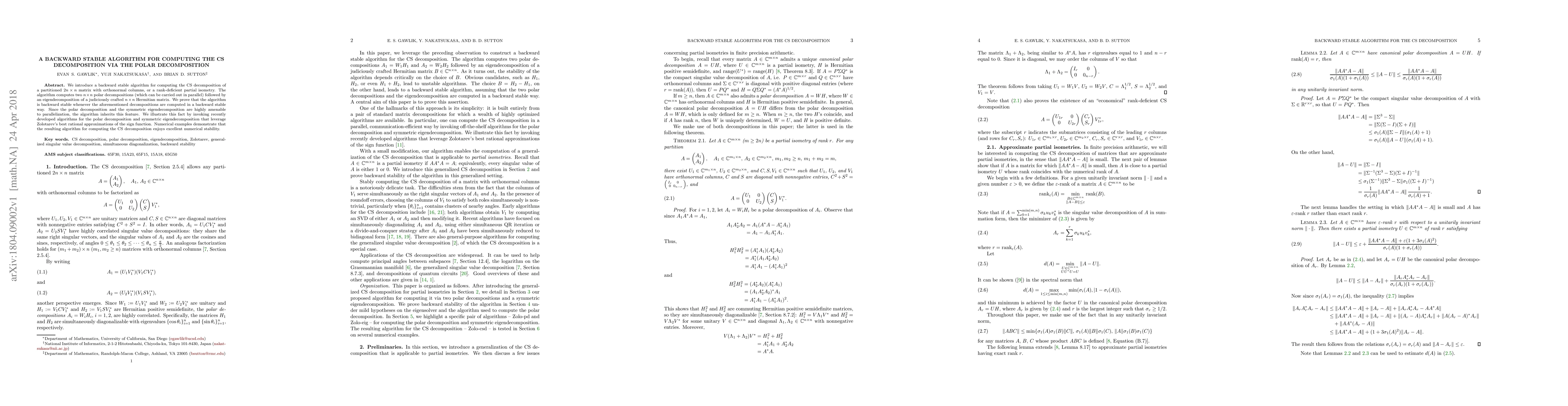 This paper presents a backward stable algorithm for computing the CS decomposition of partitioned matrices using polar decompositions and eigendecomposition. The algorithm leverages parallelizable computations and demonstrates excellent numerical stability through numerical examples.