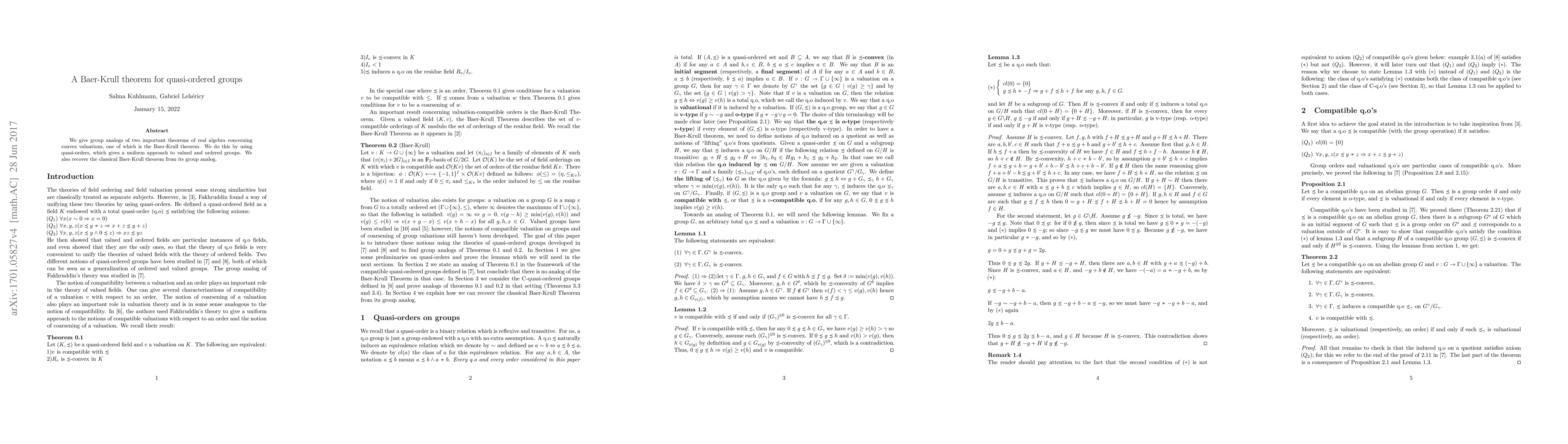 We give group analogs of two important theorems of real algebra concerning convex valuations, one of which is the Baer-Krull theorem. We do this by using quasi-orders, which gives a uniform approach to valued and ordered groups. We also recover the classical Baer-Krull theorem from its group analog.