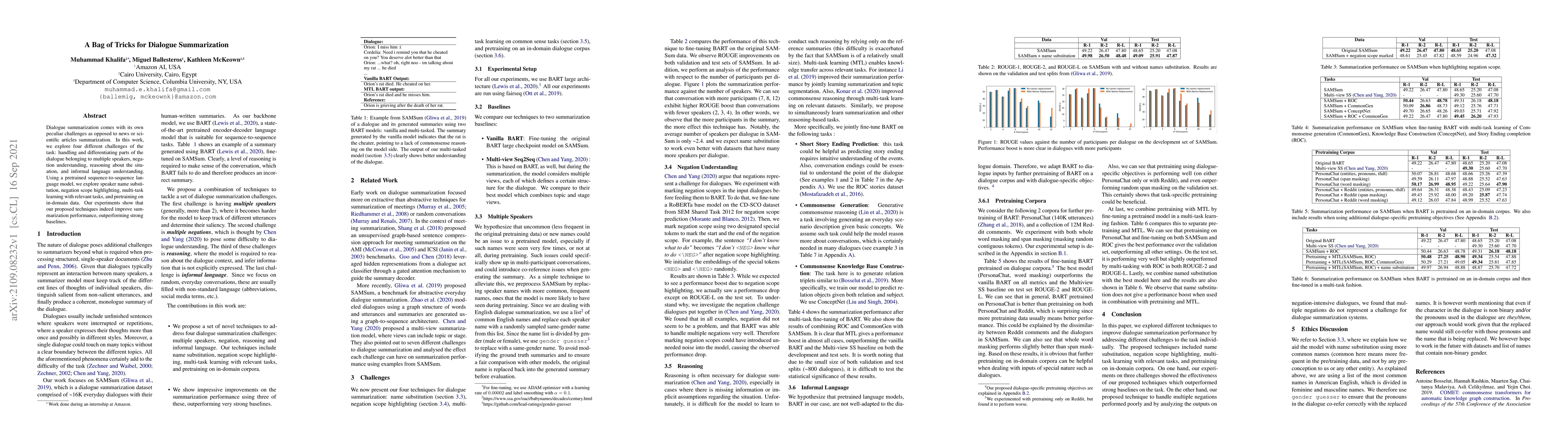 This paper investigates dialogue summarization challenges, including speaker differentiation, negation, situational reasoning, and informal language. It proposes techniques like speaker name substitution and multi-task learning, showing improved summarization performance over baselines.