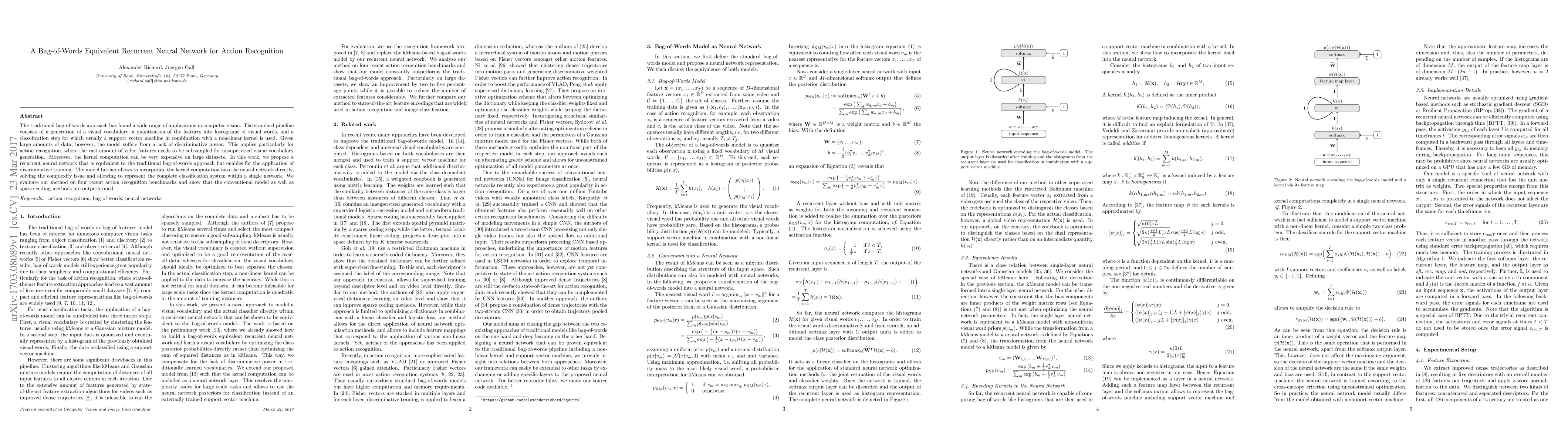 The traditional bag-of-words approach has found a wide range of applications in computer vision. The standard pipeline consists of a generation of a visual vocabulary, a quantization of the features into histograms of visual words, and a classification step for which usually a support vector machine in combination with a non-linear kernel is used. Given large amounts of data, however, the model suffers from a lack of discriminative power. This applies particularly for action recognition, where the vast amount of video features needs to be subsampled for unsupervised visual vocabulary generation. Moreover, the kernel computation can be very expensive on large datasets. In this work, we propose a recurrent neural network that is equivalent to the traditional bag-of-words approach but enables for the application of discriminative training. The model further allows to incorporate the kernel computation into the neural network directly, solving the complexity issue and allowing to represent the complete classification system within a single network. We evaluate our method on four recent action recognition benchmarks and show that the conventional model as well as sparse coding methods are outperformed.