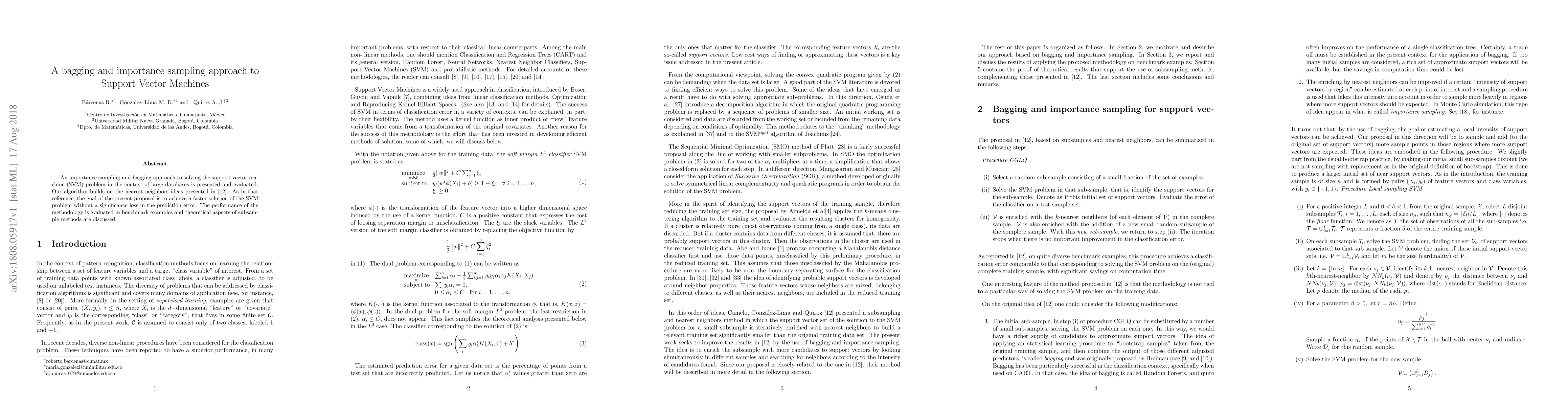 This paper proposes a bagging and importance sampling method to efficiently solve the SVM problem in large datasets, aiming for faster solutions without compromising prediction accuracy. The methodology is evaluated through benchmark examples and theoretical discussions on subsample methods.