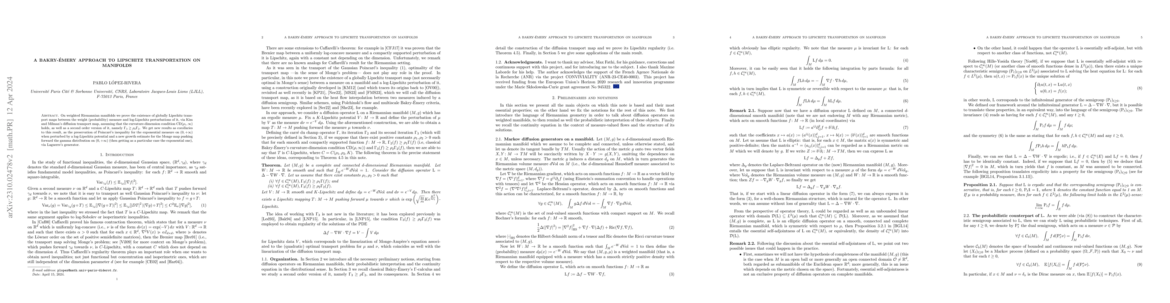 This paper establishes the existence of Lipschitz transport maps on weighted Riemannian manifolds under curvature conditions, using Kim and Milman's diffusion transport map, leading to new results on Poincaré inequality preservation and growth estimates for Monge maps.