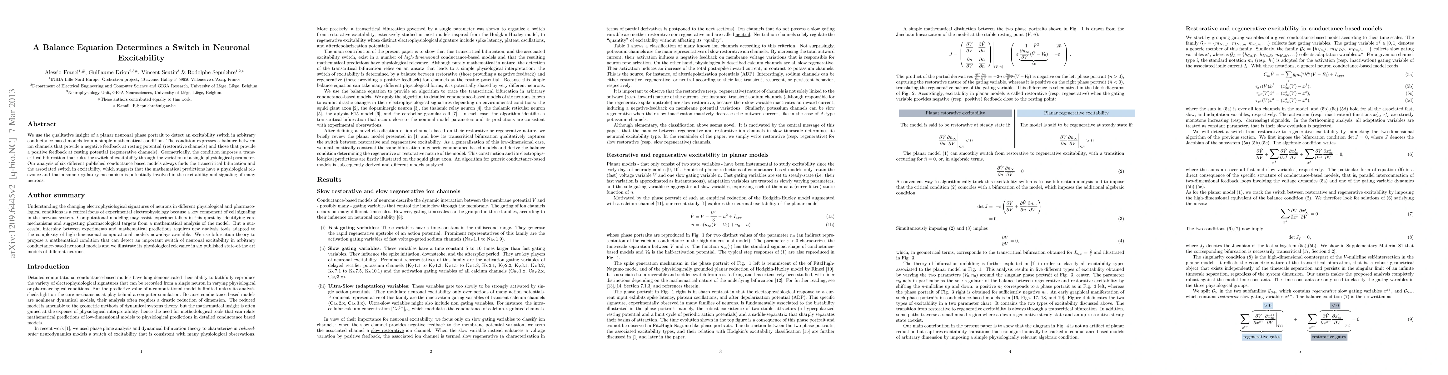 We use the qualitative insight of a planar neuronal phase portrait to detect an excitability switch in arbitrary conductance-based models from a simple mathematical condition. The condition expresses a balance between ion channels that provide a negative feedback at resting potential (restorative channels) and those that provide a positive feedback at resting potential (regenerative channels). Geometrically, the condition imposes a transcritical bifurcation that rules the switch of excitability through the variation of a single physiological parameter. Our analysis of six different published conductance based models always finds the transcritical bifurcation and the associated switch in excitability, which suggests that the mathematical predictions have a physiological relevance and that a same regulatory mechanism is potentially involved in the excitability and signaling of many neurons.