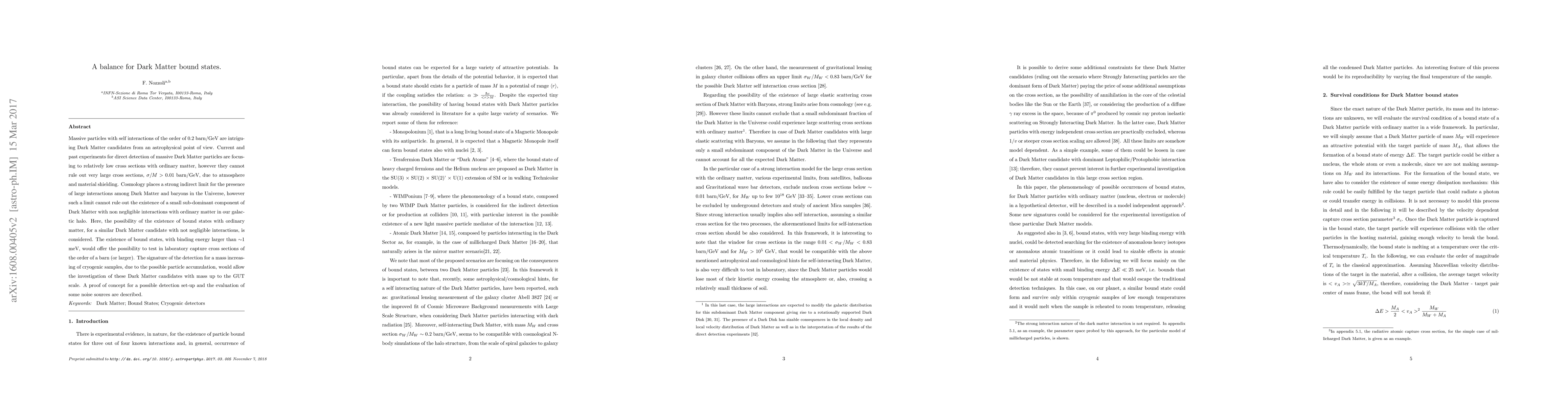 Massive particles with self interactions of the order of 0.2 barn/GeV are intriguing Dark Matter candidates from an astrophysical point of view. Current and past experiments for direct detection of massive Dark Matter particles are focusing to relatively low cross sections with ordinary matter, however they cannot rule out very large cross sections, $\sigma/M > 0.01$ barn/GeV, due to atmosphere and material shielding. Cosmology places a strong indirect limit for the presence of large interactions among Dark Matter and baryons in the Universe, however such a limit cannot rule out the existence of a small sub-dominant component of Dark Matter with non negligible interactions with ordinary matter in our galactic halo. Here, the possibility of the existence of bound states with ordinary matter, for a similar Dark Matter candidate with not negligible interactions, is considered. The existence of bound states, with binding energy larger than $\sim$1 meV, would offer the possibility to test in laboratory capture cross sections of the order of a barn (or larger). The signature of the detection for a mass increasing of cryogenic samples, due to the possible particle accumulation, would allow the investigation of these Dark Matter candidates with mass up to the GUT scale. A proof of concept for a possible detection set-up and the evaluation of some noise sources are described.