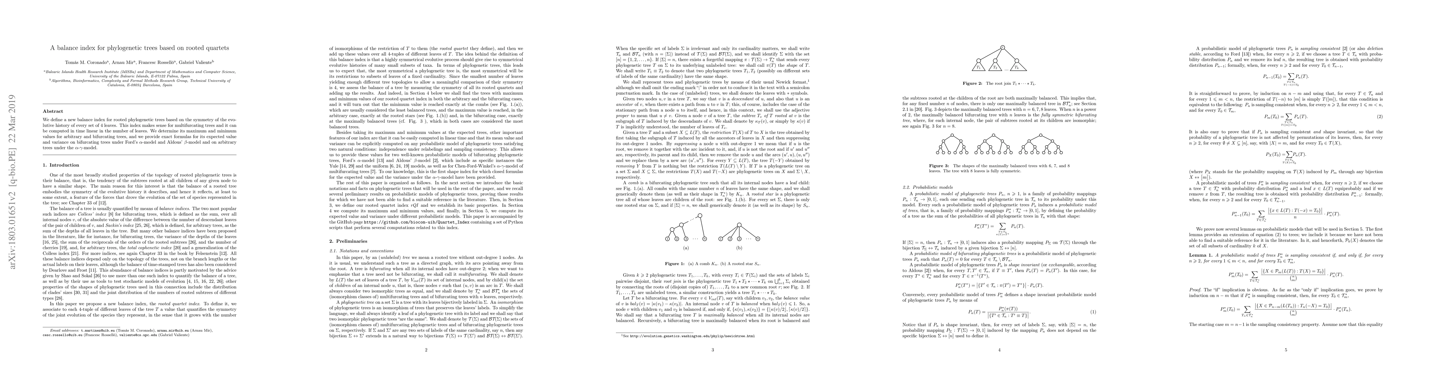 This paper introduces a new balance index for rooted phylogenetic trees based on the symmetry of evolutionary histories of quartets of leaves, computable in linear time. It determines maximum and minimum values, and provides exact formulas for expected value and variance under various evolutionary models.