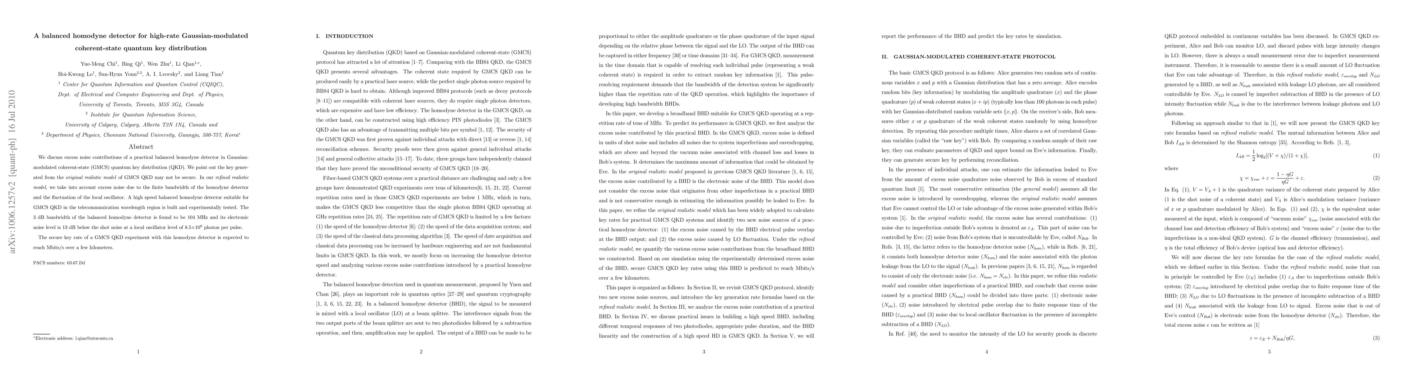 This paper investigates the excess noise in a balanced homodyne detector for Gaussian-modulated coherent-state quantum key distribution (QKD), revealing potential insecurity in the key generation process. A refined model accounting for detector bandwidth and local oscillator fluctuations is proposed, leading to the experimental realization of a high-speed detector achieving a secure key rate of Mbits/s over several kilometers.