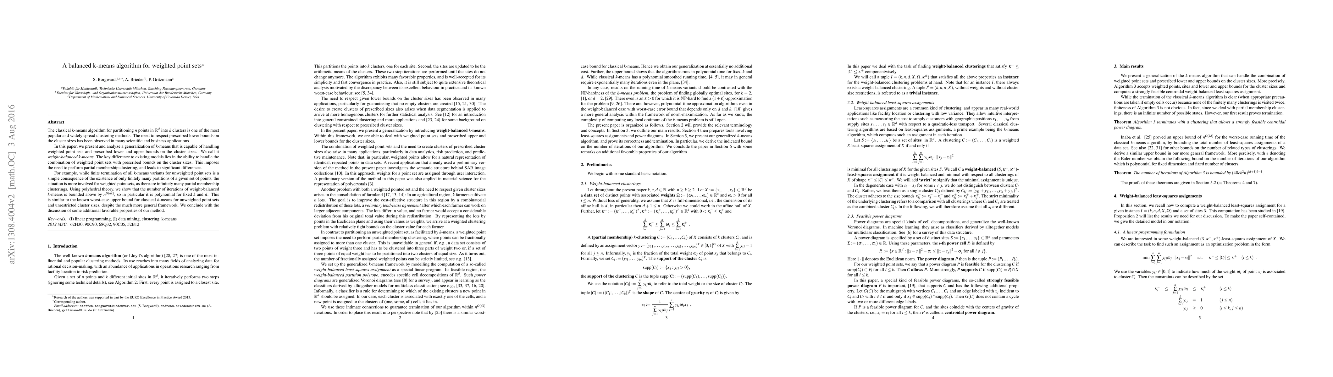 This paper introduces a weight-balanced $k$-means algorithm that extends the classical $k$-means method to handle weighted point sets and enforce lower and upper bounds on cluster sizes. It demonstrates that the algorithm terminates in polynomial time for fixed dimensions and cluster numbers, despite the complexity introduced by weighted points and size constraints.