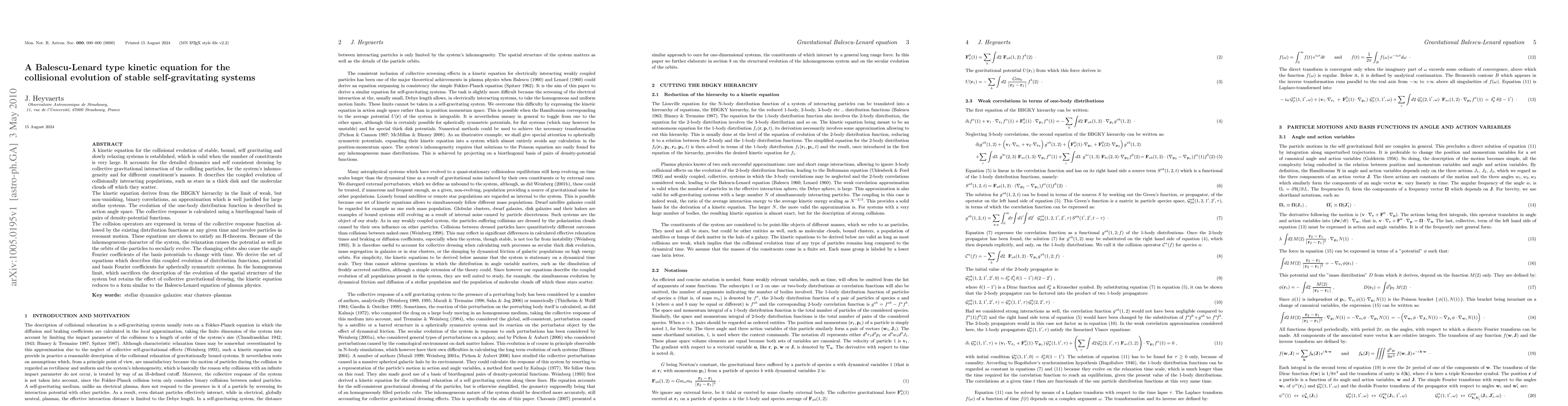 A new kinetic equation explains how stable self-gravitating systems evolve through collisions, considering collective gravitational interactions and different particle masses. It reduces to a familiar form in the homogeneous limit, providing insights into the dynamics of these systems.