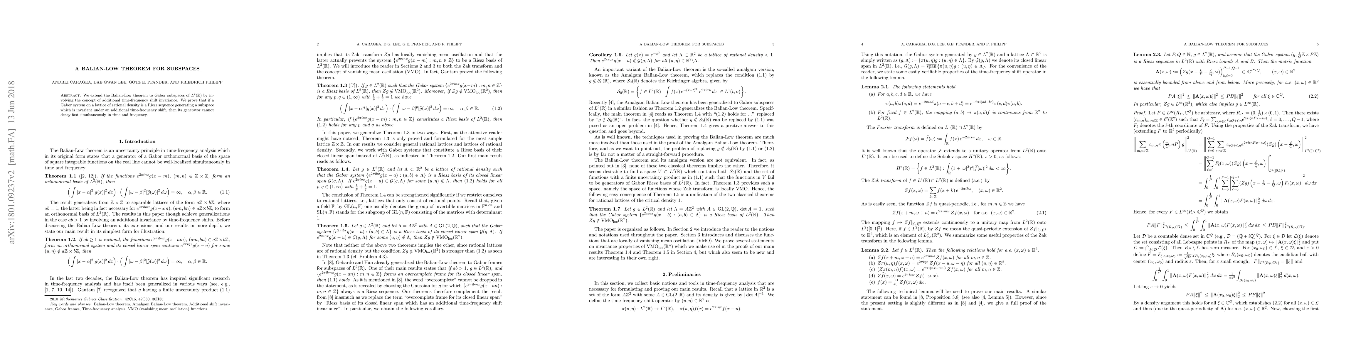 A Balian-Low theorem extension proves that a Gabor system with time-frequency shift invariance cannot decay too fast in both time and frequency simultaneously.