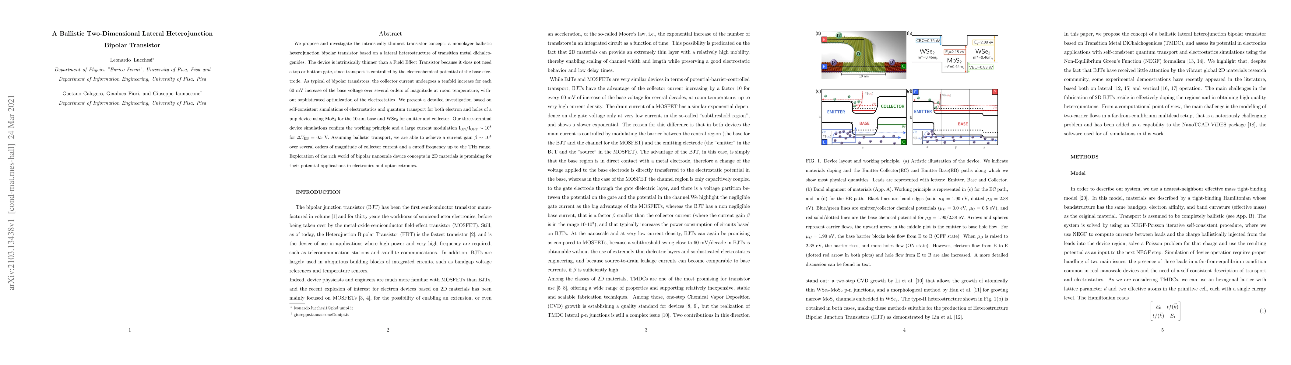 This research proposes a novel monolayer ballistic lateral heterojunction bipolar transistor using transition metal dichalcogenides, demonstrating intrinsic thinness and high current modulation ratio of 10$^8$ without the need for gates. Simulations confirm its operational principle, current gain, and potential for THz frequency applications.