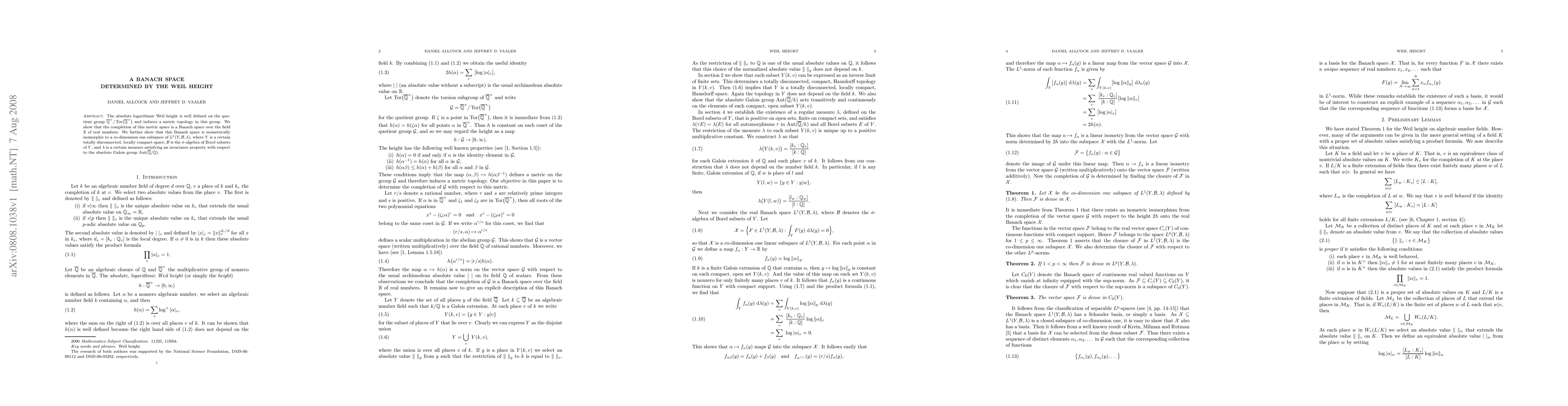 The absolute logarithmic Weil height is well defined on the group of units of the algebraic closure of the rational numbers, modulo roots of unity, and induces a metric topology on this group. We show that the completion of this metric space is a Banach space over the field of real numbers. We further show that this Banach space is isometrically isomorphic to a co-dimension one subspace of L1 of a certain totally disconnected, locally compact space, equipped with a certain measure satisfying an invariance property with respect to the absolute Galois group.