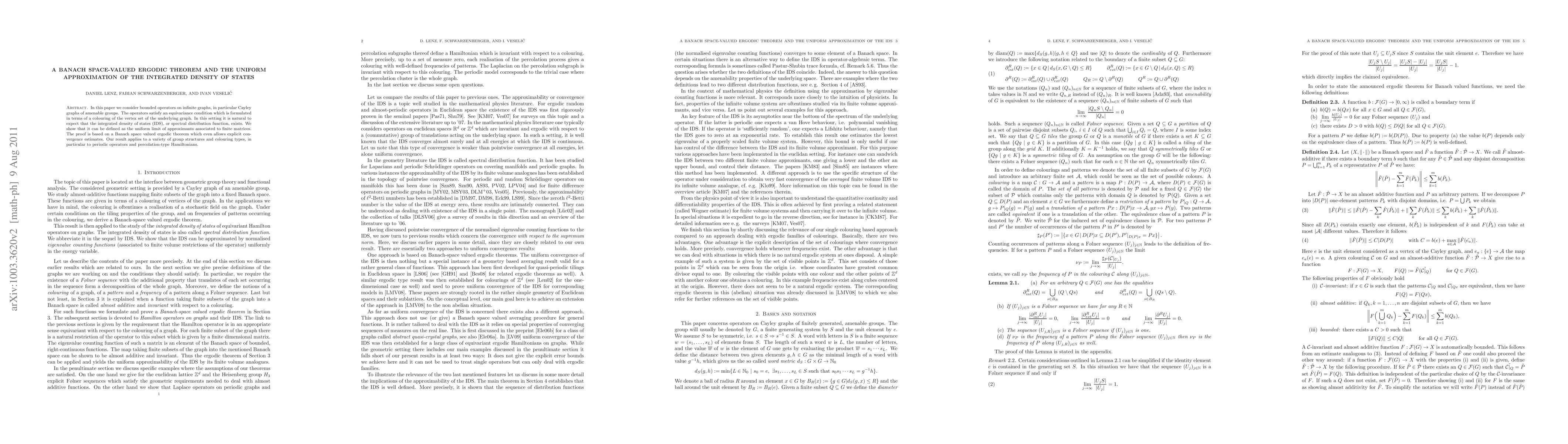 This paper establishes a Banach space-valued ergodic theorem to define the integrated density of states (IDS) for bounded operators on infinite graphs, particularly Cayley graphs of amenable groups. The IDS is shown to be the uniform limit of approximants from finite matrices, with explicit convergence estimates.