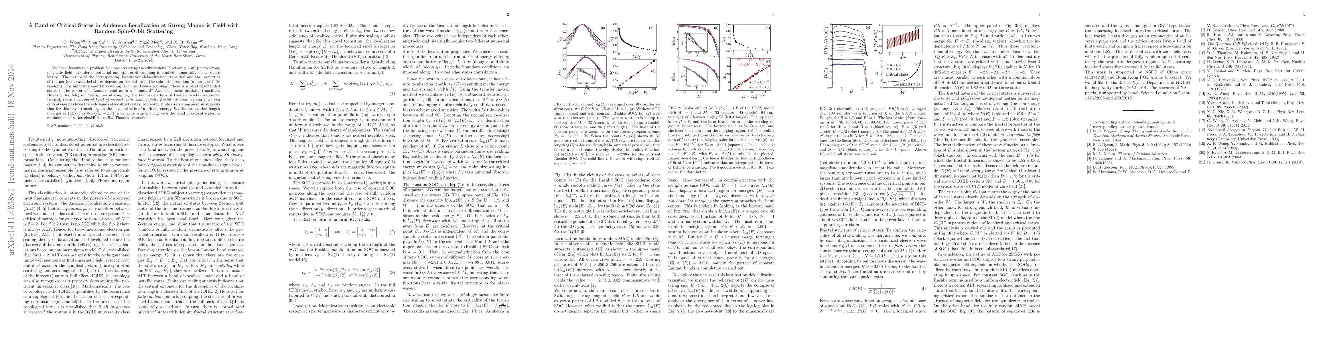 This paper investigates the Anderson localization in a two-dimensional electron gas under strong magnetic fields, random potential, and spin-orbit coupling. It finds a band of critical states with fractal structure for fully random spin-orbit coupling, contrasting with extended states for uniform coupling, and suggests a Berezinskii-Kosterlitz-Thouless-like transition.