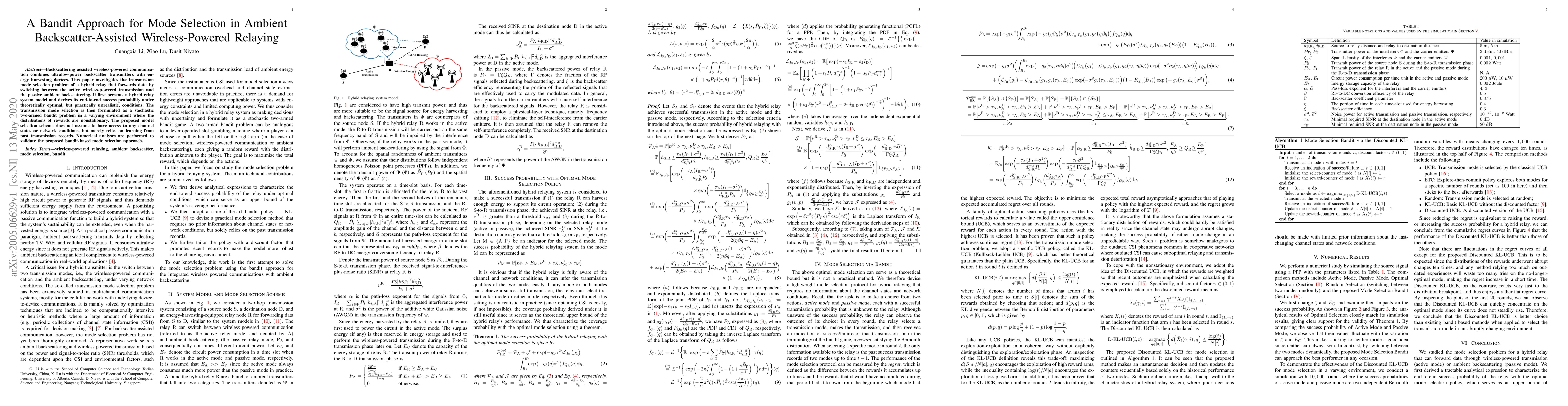 This paper proposes a hybrid relay system model for ambient backscatter-assisted wireless-powered communication, formulating mode selection as a stochastic two-armed bandit problem to optimize data forwarding between active and passive modes. The approach learns from past transmissions without requiring channel state information, validated through numerical analysis.