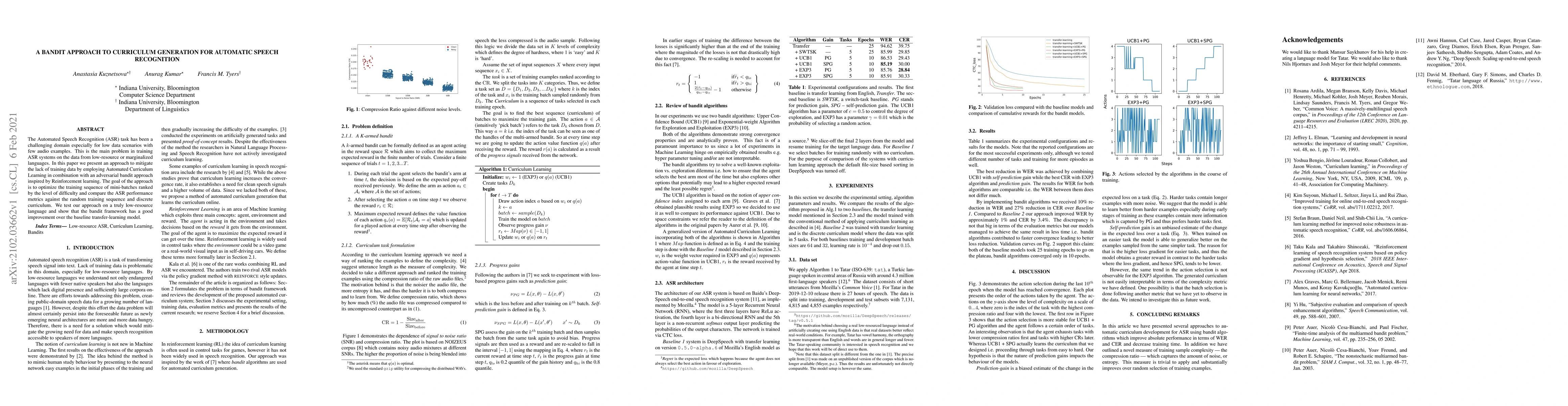 The Automated Speech Recognition (ASR) task has been a challenging domain especially for low data scenarios with few audio examples. This is the main problem in training ASR systems on the data from low-resource or marginalized languages. In this paper we present an approach to mitigate the lack of training data by employing Automated Curriculum Learning in combination with an adversarial bandit approach inspired by Reinforcement learning. The goal of the approach is to optimize the training sequence of mini-batches ranked by the level of difficulty and compare the ASR performance metrics against the random training sequence and discrete curriculum. We test our approach on a truly low-resource language and show that the bandit framework has a good improvement over the baseline transfer-learning model.