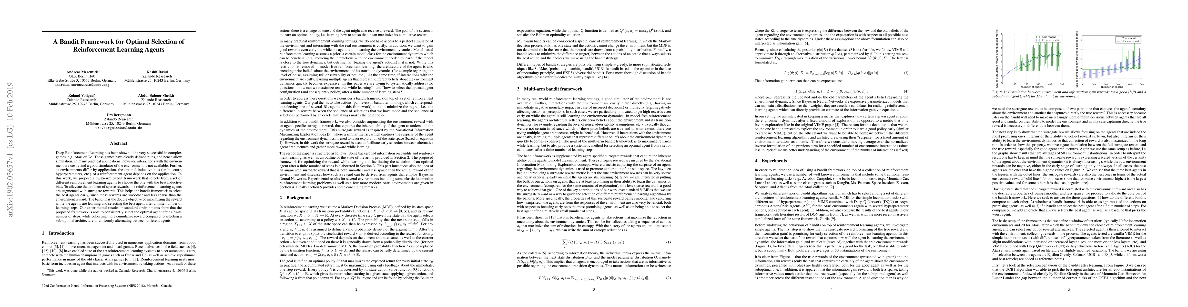 Deep Reinforcement Learning has been shown to be very successful in complex games, e.g. Atari or Go. These games have clearly defined rules, and hence allow simulation. In many practical applications, however, interactions with the environment are costly and a good simulator of the environment is not available. Further, as environments differ by application, the optimal inductive bias (architecture, hyperparameters, etc.) of a reinforcement agent depends on the application. In this work, we propose a multi-arm bandit framework that selects from a set of different reinforcement learning agents to choose the one with the best inductive bias. To alleviate the problem of sparse rewards, the reinforcement learning agents are augmented with surrogate rewards. This helps the bandit framework to select the best agents early, since these rewards are smoother and less sparse than the environment reward. The bandit has the double objective of maximizing the reward while the agents are learning and selecting the best agent after a finite number of learning steps. Our experimental results on standard environments show that the proposed framework is able to consistently select the optimal agent after a finite number of steps, while collecting more cumulative reward compared to selecting a sub-optimal architecture or uniformly alternating between different agents.