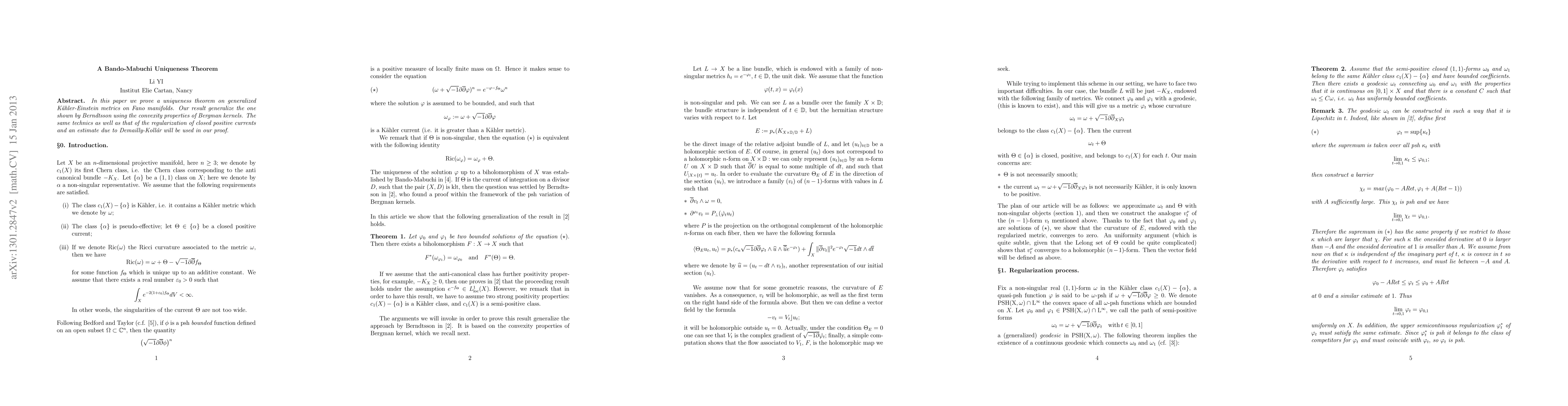 In this paper we prove a uniqueness theorem on generalized Kahler-Einstein metrics on Fano manifolds. Our result generalize the one shown by Berndtsson using the convexity properties of Bergman kernels. The same technics as well as that of the regularization of closed positive currents and an estimate due to Demailly-Kollar will be used in our proof.
