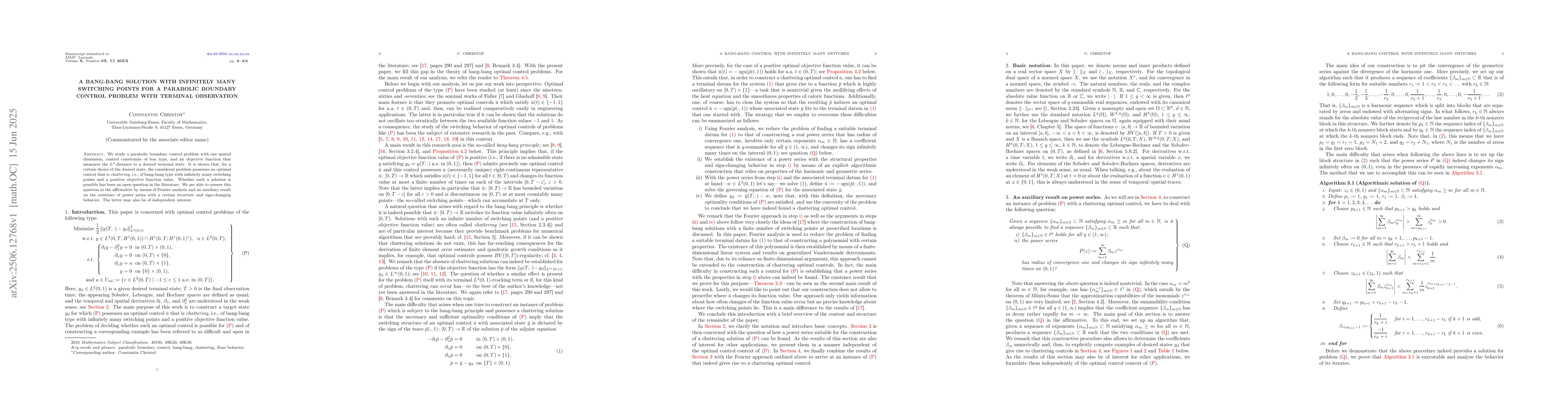 We study a parabolic boundary control problem with one spatial dimension, control constraints of box type, and an objective function that measures the $L^2$-distance to a desired terminal state. It is shown that, for a certain choice of the desired state, the considered problem possesses an optimal control that is chattering, i.e., of bang-bang type with infinitely many switching points and a positive objective function value. Whether such a solution is possible has been an open question in the literature. We are able to answer this question in the affirmative by means of Fourier analysis and an auxiliary result on the existence of power series with a certain structure and sign-changing behavior. The latter may also be of independent interest.