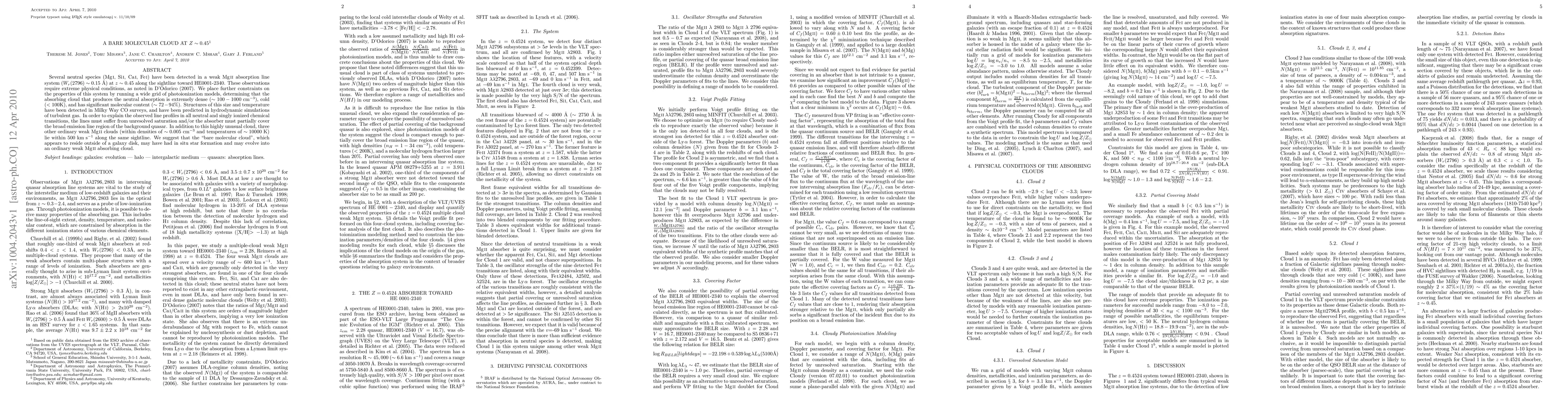 Several neutral species (MgI, SiI, CaI, FeI) have been detected in a weak MgII absorption line system (W_r(2796)~0.15 Angstroms) at z~0.45 along the sightline toward HE0001-2340. These observations require extreme physical conditions, as noted in D'Odorico (2007). We place further constraints on the properties of this system by running a wide grid of photoionization models, determining that the absorbing cloud that produces the neutral absorption is extremely dense (~100-1000/cm^3), cold (<100 K), and has significant molecular content (~72-94%). Structures of this size and temperature have been detected in Milky Way CO surveys, and have been predicted in hydrodynamic simulations of turbulent gas. In order to explain the observed line profiles in all neutral and singly ionized chemical transitions, the lines must suffer from unresolved saturation and/or the absorber must partially cover the broad emission line region of the background quasar. In addition to this highly unusual cloud, three other ordinary weak MgII clouds (within densities of ~0.005/cm^3 and temperatures of ~10000K) lie within 500 km/s along the same sightline. We suggest that the "bare molecular cloud", which appears to reside outside of a galaxy disk, may have had in situ star formation and may evolve into an ordinary weak MgII absorbing cloud.