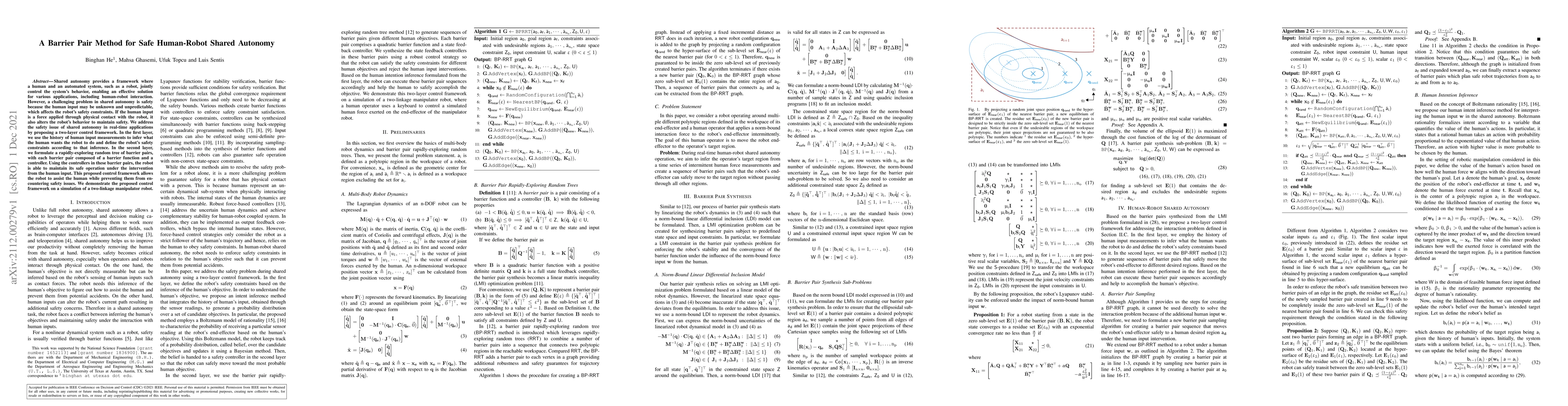 The paper proposes a two-layer control framework for safe human-robot shared autonomy, utilizing historical human input data to infer intentions and define safety constraints. The second layer employs a barrier pair method to maintain safe operation by dynamically adjusting to human interventions. The framework is demonstrated through simulation on a two-linkage manipulator.