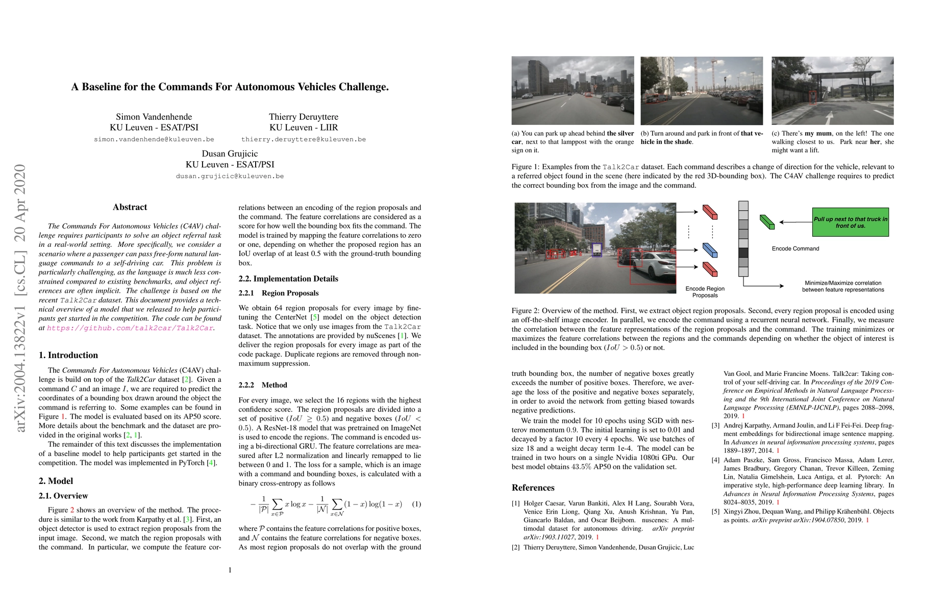 The Commands For Autonomous Vehicles (C4AV) challenge requires participants to solve an object referral task in a real-world setting. More specifically, we consider a scenario where a passenger can pass free-form natural language commands to a self-driving car. This problem is particularly challenging, as the language is much less constrained compared to existing benchmarks, and object references are often implicit. The challenge is based on the recent \texttt{Talk2Car} dataset. This document provides a technical overview of a model that we released to help participants get started in the competition. The code can be found at https://github.com/talk2car/Talk2Car.