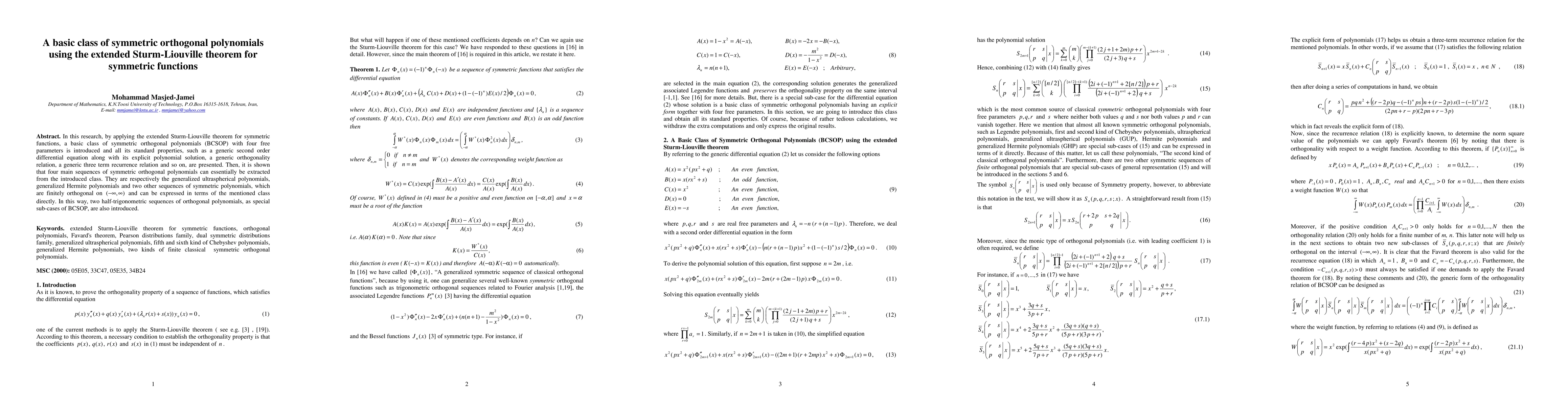 This paper introduces a new class of symmetric orthogonal polynomials (BCSOP) using the extended Sturm-Liouville theorem, detailing its properties, including a second-order differential equation and recurrence relations. It demonstrates how BCSOP encompasses generalized ultraspherical, generalized Hermite polynomials, and two other sequences.