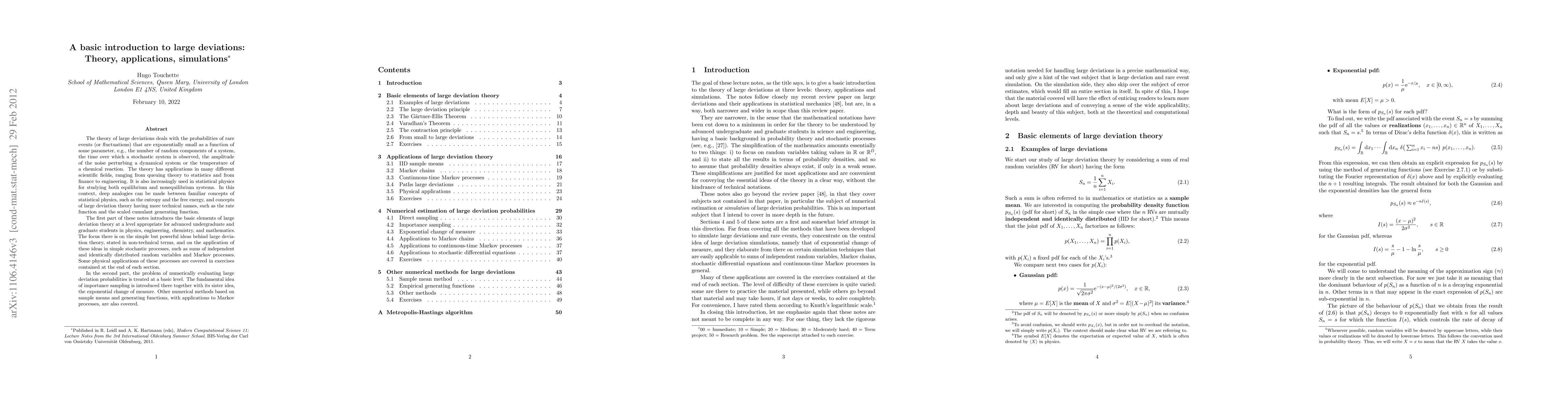The theory of large deviations deals with the probabilities of rare events (or fluctuations) that are exponentially small as a function of some parameter, e.g., the number of random components of a system, the time over which a stochastic system is observed, the amplitude of the noise perturbing a dynamical system or the temperature of a chemical reaction. The theory has applications in many different scientific fields, ranging from queuing theory to statistics and from finance to engineering. It is also increasingly used in statistical physics for studying both equilibrium and nonequilibrium systems. In this context, deep analogies can be made between familiar concepts of statistical physics, such as the entropy and the free energy, and concepts of large deviation theory having more technical names, such as the rate function and the scaled cumulant generating function. The first part of these notes introduces the basic elements of large deviation theory at a level appropriate for advanced undergraduate and graduate students in physics, engineering, chemistry, and mathematics. The focus there is on the simple but powerful ideas behind large deviation theory, stated in non-technical terms, and on the application of these ideas in simple stochastic processes, such as sums of independent and identically distributed random variables and Markov processes. Some physical applications of these processes are covered in exercises contained at the end of each section. In the second part, the problem of numerically evaluating large deviation probabilities is treated at a basic level. The fundamental idea of importance sampling is introduced there together with its sister idea, the exponential change of measure. Other numerical methods based on sample means and generating functions, with applications to Markov processes, are also covered.