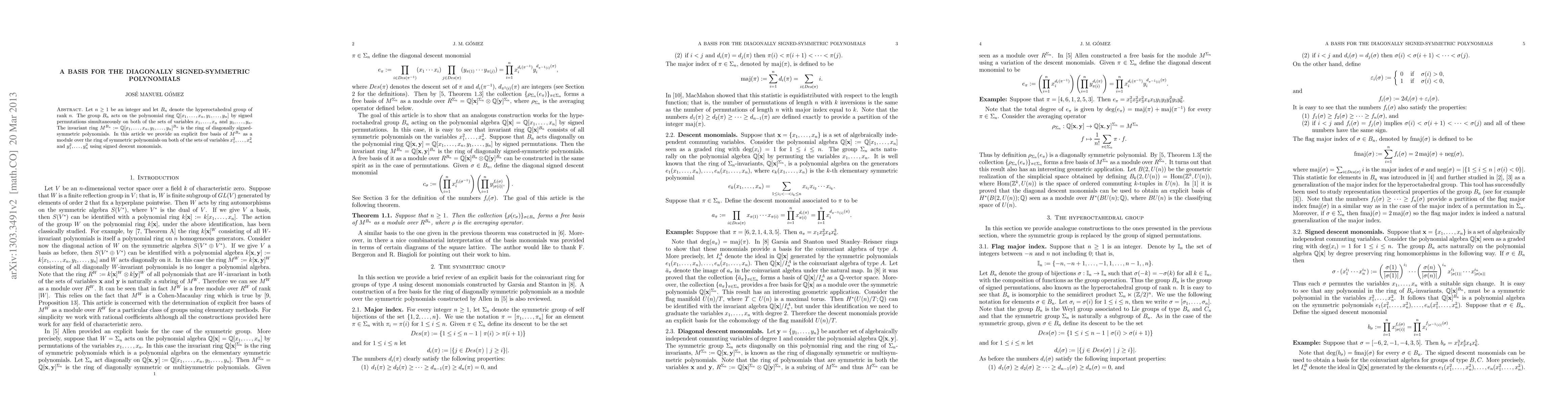 Let n>0 be an integer and let B_{n} denote the hyperoctahedral group of rank n. The group B_{n} acts on the polynomial ring Q[x_{1},...,x_{n},y_{1},...,y_{n}] by signed permutations simultaneously on both of the sets of variables x_{1},...,x_{n} and y_{1},...,y_{n}. The invariant ring M^{B_{n}}:=Q[x_{1},...,x_{n},y_{1},...,y_{n}]^{B_{n}} is the ring of diagonally signed-symmetric polynomials. In this article we provide an explicit free basis of M^{B_{n}} as a module over the ring of symmetric polynomials on both of the sets of variables x_{1}^{2},..., x^{2}_{n} and y_{1}^{2},..., y^{2}_{n} using signed descent monomials.